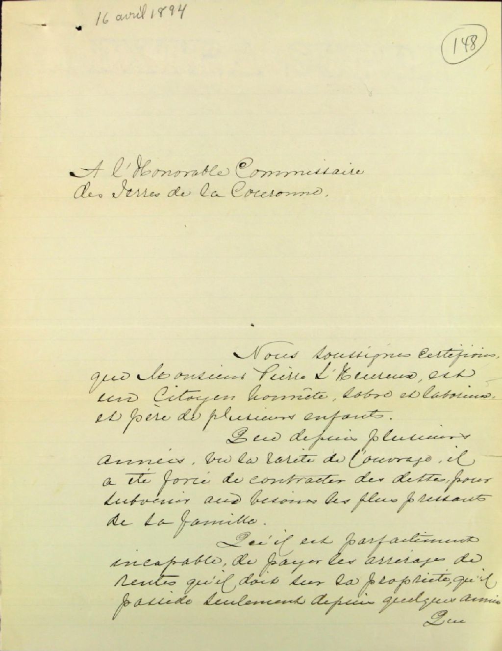 Lettre de ? Bélanger, curé de Saint-Roch-de-Québec, A.C. Rhéaume, P.E. Blais, J.H. Gignac et Thomas Duchaine, au commissaire des terres de la Couronne, afin que Pierre L'Heureux obtienne diminution des arrérages de rente sur la moitié du lot 33 du cadastre du quartier Saint-Roch-de-Québec, 16 avril 1894, Archives nationales à Québec, Fonds Ministère des Terres et Forêts, (03Q,E21,S64,SS5,SSS8,D148).
