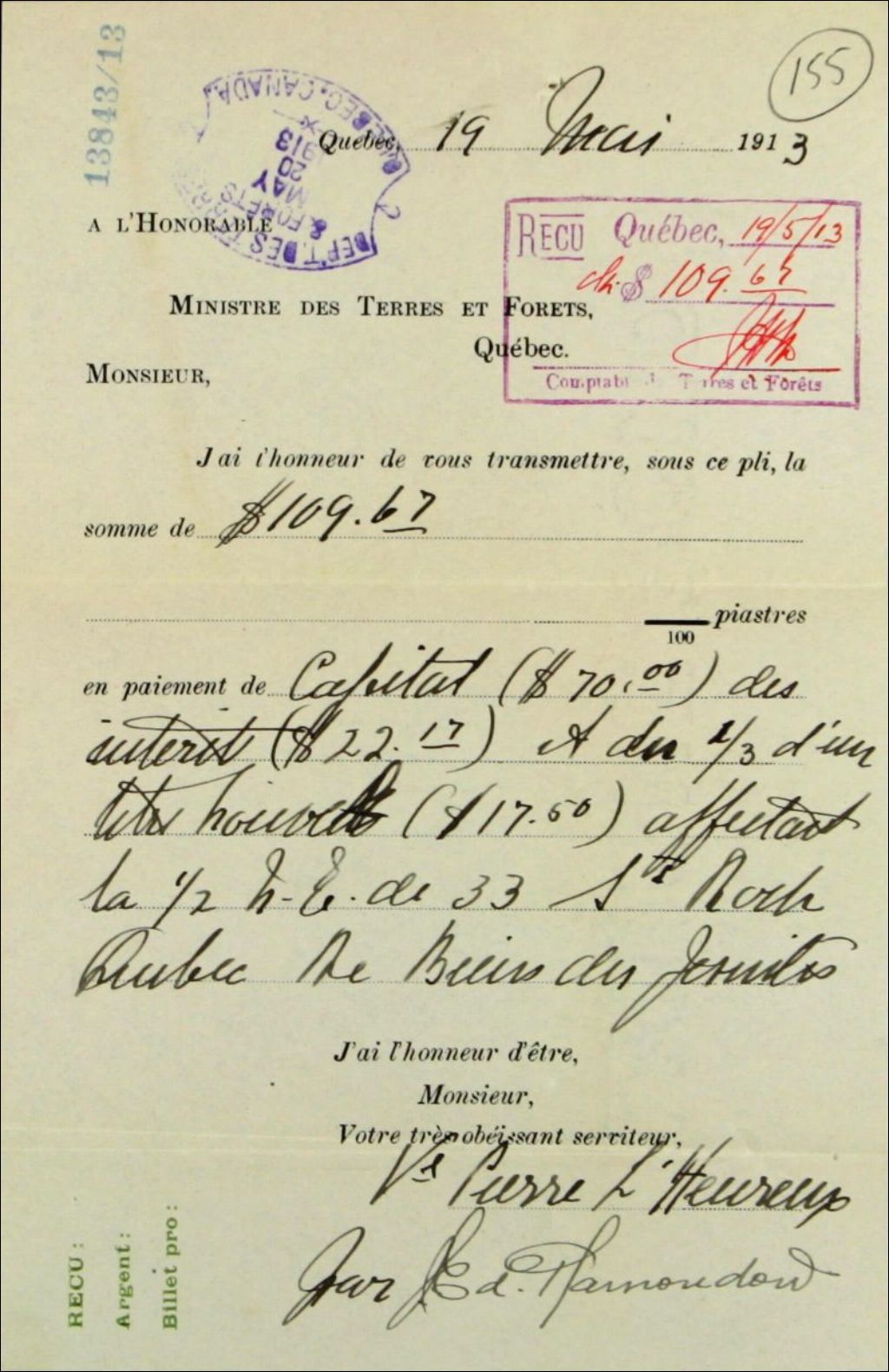 Reçu du Ministre des Terres et Forêts de la province de Québec, à la veuve Pierre L'Heureux, en paiement des arrérages de rentes affectant la moitié nord-est du lot 33 du cadastre du quartier Saint-Roch-de-Québec, 19 mai 1913, Archives nationales à Québec, Fonds Ministère des Terres et Forêts, (03Q,E21,S64,SS5,SSS8,D155).