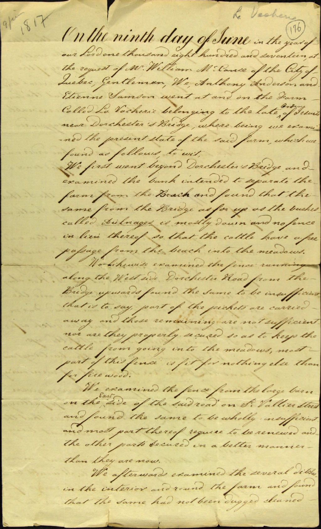 Rapport de visite de la ferme nommée la Vacherie située près du pont Dorchester effectué à la requête de William McCance, de la ville de Québec, par Anthony Anderson et Étienne Samson, 9 juin 1817, Archives nationales à Québec, Fonds Ministère des Terres et Forêts, (03Q,E21,S64,SS5,SSS8,D176).