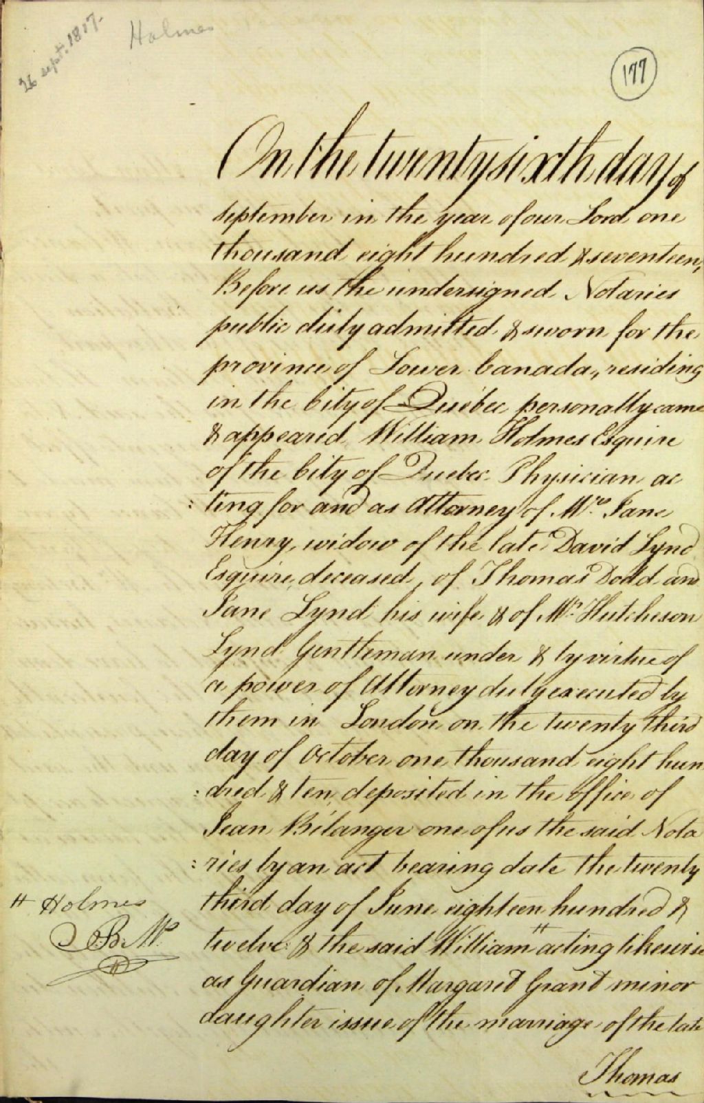 - Bail (14 ans) de la ferme nommée la Vacherie ; par William Holmes, médecin, de la ville de Québec, procureur de Jane Henry, veuve de David Lynd, de Thomas Dodd et Jane Lynd, son épouse, de Hutchison Lynd, et tuteur de Margaret Grant, fille mineure issue du mariage de Thomas Grant et d'Anne Lynd, son épouse, à William McCance, lieutenant du quatrième bataillon des Royal Veterans, de la ville de Québec
