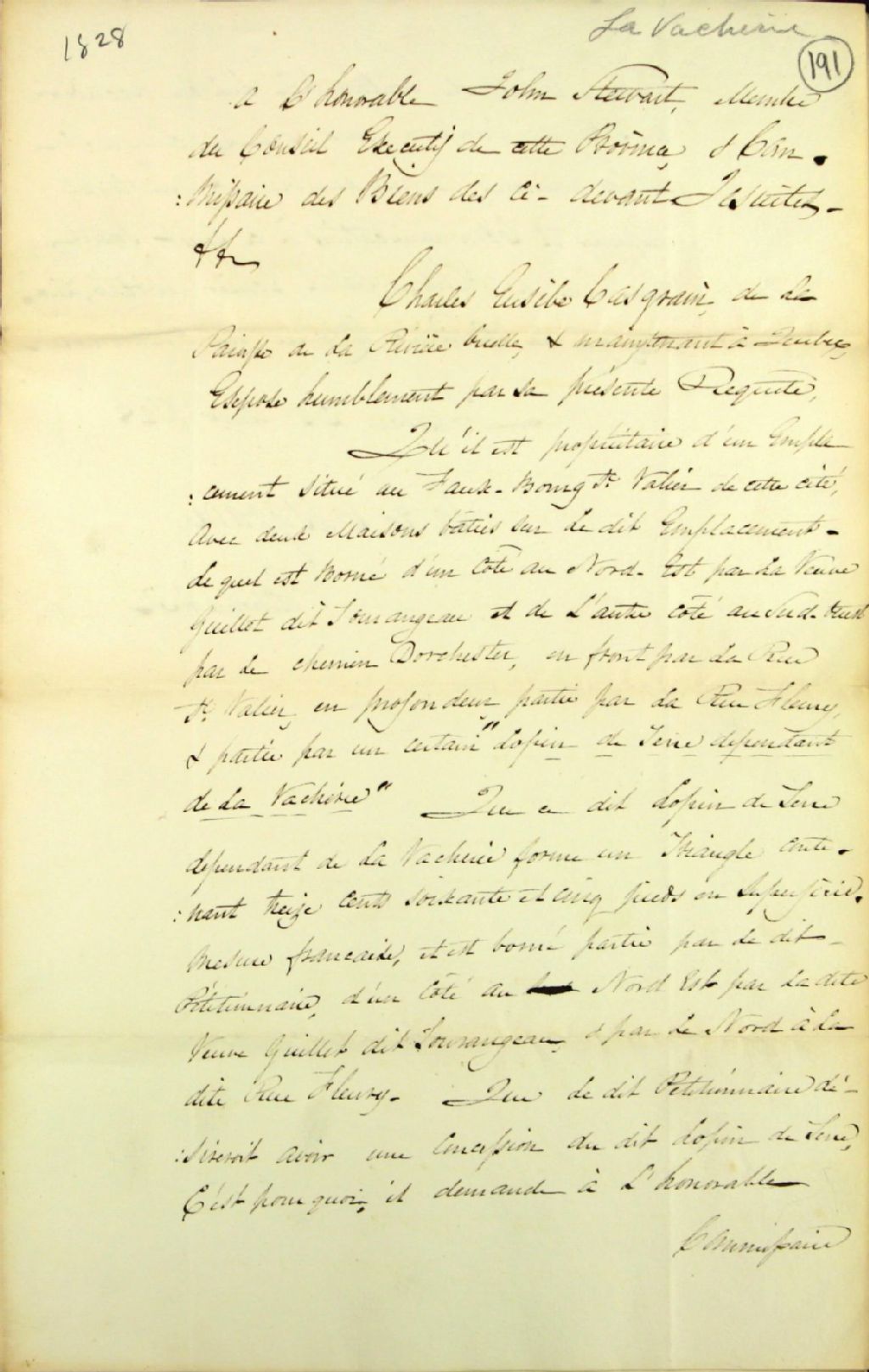 Requête de Charles-Euzèbe Casgrain, de la paroisse de la Rivière-Ouelle et maintenant à Québec, à John Stewart, membre du conseil exécutif de cette province et commissaire des biens des Jésuites, de lui accorder contrat de concession d'un lopin de terre dépendant de la ferme nommée la Vacherie