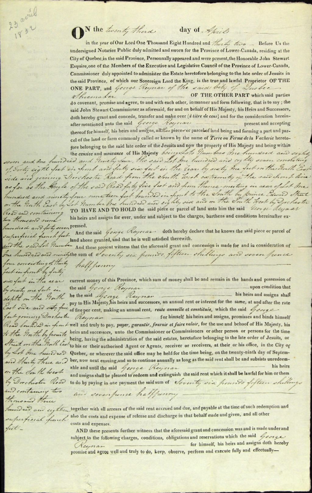 Concession d'une pièce de terre située dans la ferme nommée la Vacherie ; par John Stewart, un des membres des conseils exécutif et législatif de la province du Bas-Canada et commissaire des biens des Jésuites, à George Reynar, cordonnier, de la ville de Québec, 23 avril 1832, Archives nationales à Québec, Fonds Ministère des Terres et Forêts, (03Q,E21,S64,SS5,SSS8,D195).
