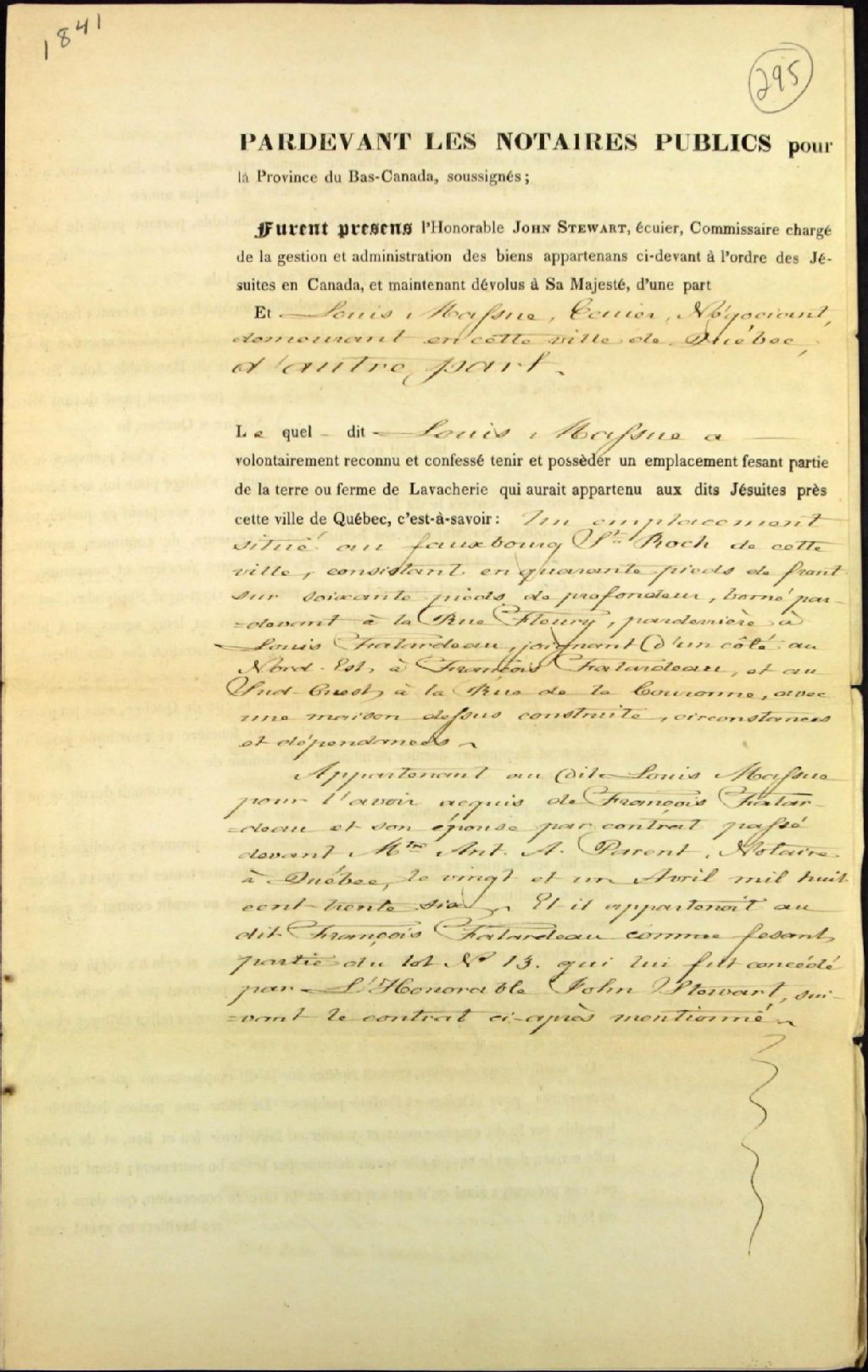 Titre-nouvel par l'honorable John Steward, commissaire chargé de la gestion des biens des Jésuites, à Louis Massue (Masson ?), négociant, demeurant à Québec, pour une terre faisant partie de La Vacherie