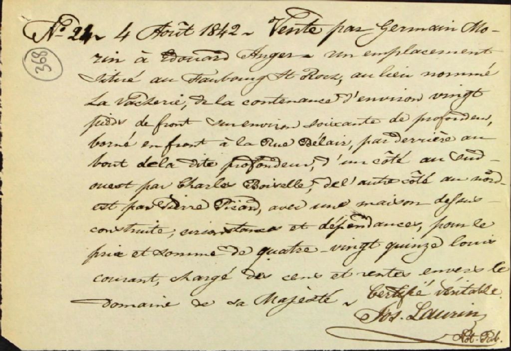 Vente d'un emplacement situé au faubourg Saint-Roch, au lieu nommé La Vacherie, par Germain Morin, à Edouard Anger, 4 août 1842, Archives nationales à Québec, Fonds Ministère des Terres et Forêts, (03Q,E21,S64,SS5,SSS8,D368).