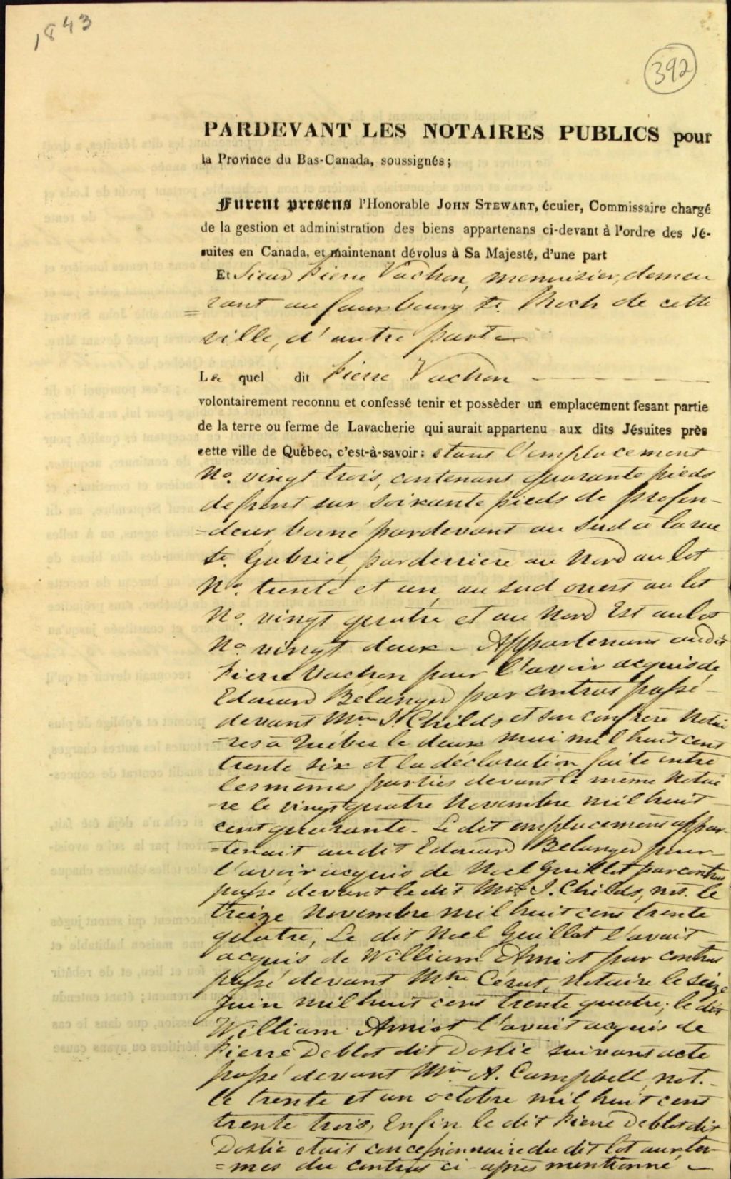 - Titre-nouvel de terre à La Vacherie par l'honorable John Steward, commissaire chargé de la gestion des biens des Jésuites, à Pierre Vachon, menuisier, demeurant au faubourg Saint-Roch