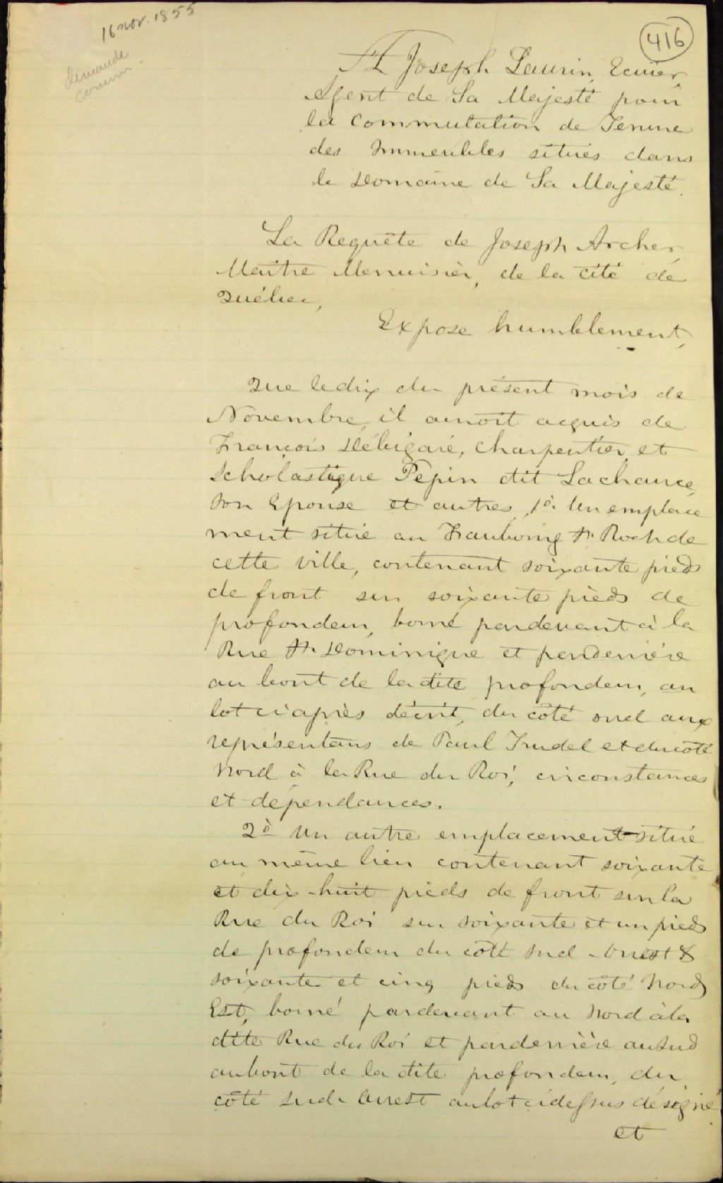 - Application de Joseph Archer, maître menuisier, de la cité de Québec, pour la commutation de la tenure de 2 emplacements au faubourg Saint-Roch, rue Saint-Dominique et du Roi, adressé à Joseph Laurin, agent de Sa Majesté