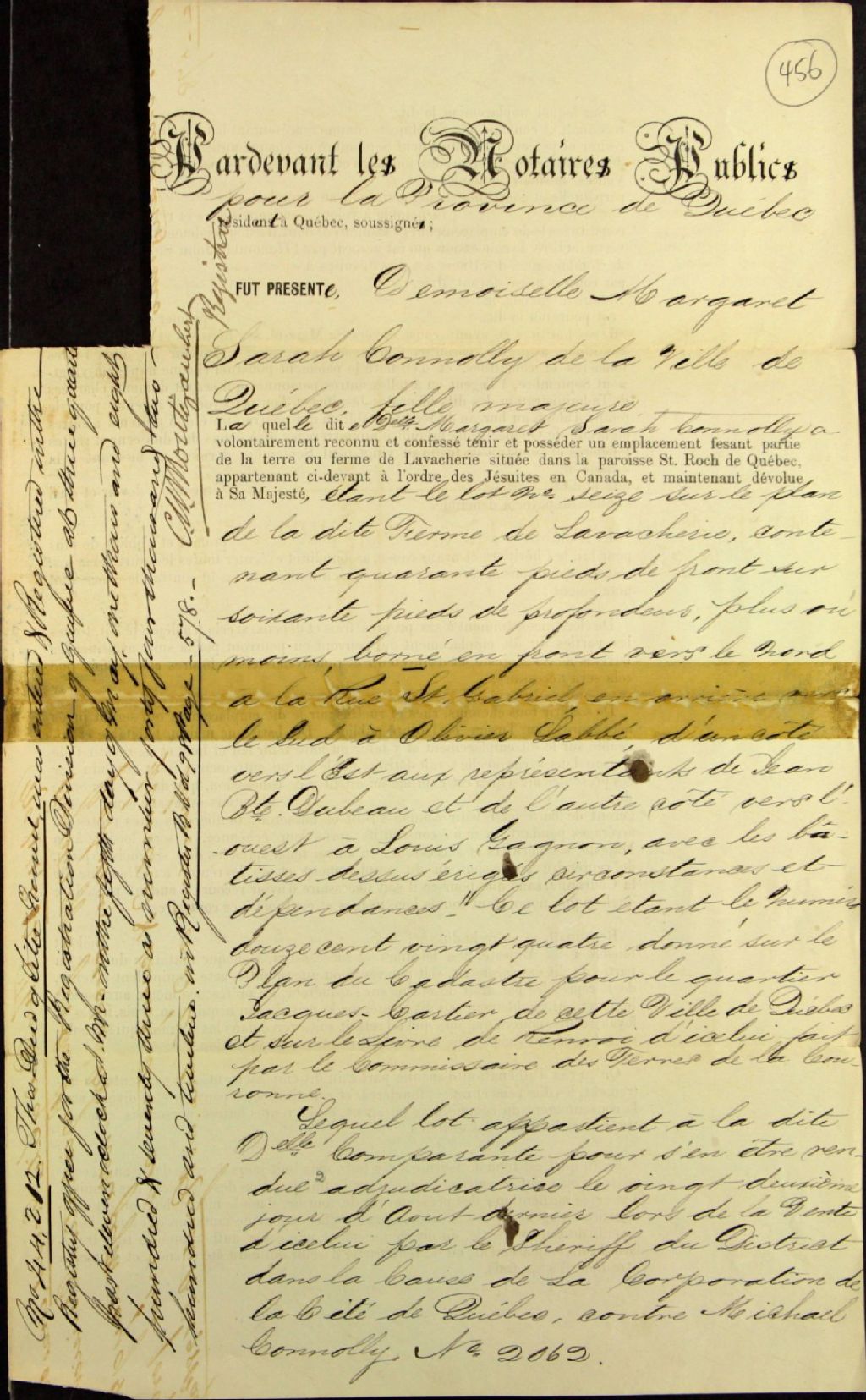 Titre-nouvel de terre à La Vacherie par-devant les Notaires Publics, résidents à Québec, soussignés, à demoiselle Margaret Sarah Connolly, de la ville de Québec, fille majeure, 1 mai 1873, Archives nationales à Québec, Fonds Ministère des Terres et Forêts, (03Q,E21,S64,SS5,SSS8,D456).
