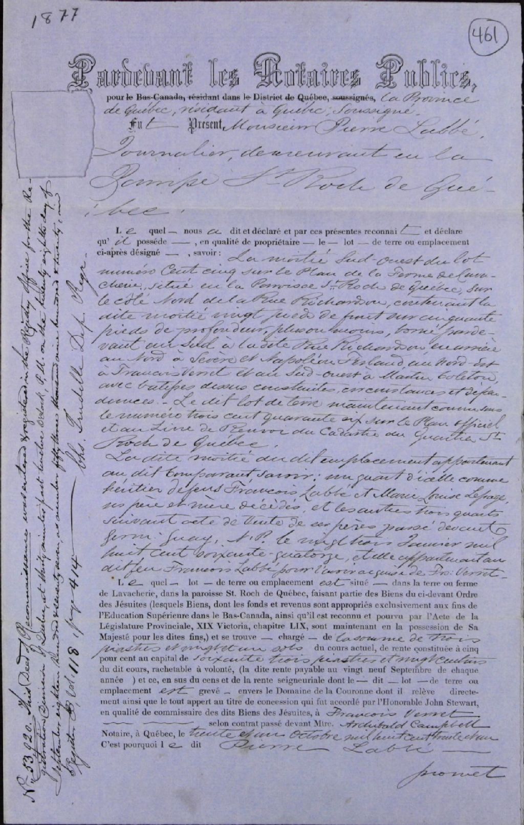 Reconnaissance d'un emplacement, par-devant les notaires publics du Bas-Canada, situé audit lieu de La Vacherie, par Pierre Labbé, journalier, demeurant en la paroisse Saint-Roch, 12 septembre 1877, Archives nationales à Québec, Fonds Ministère des Terres et Forêts, (03Q,E21,S64,SS5,SSS8,D461).