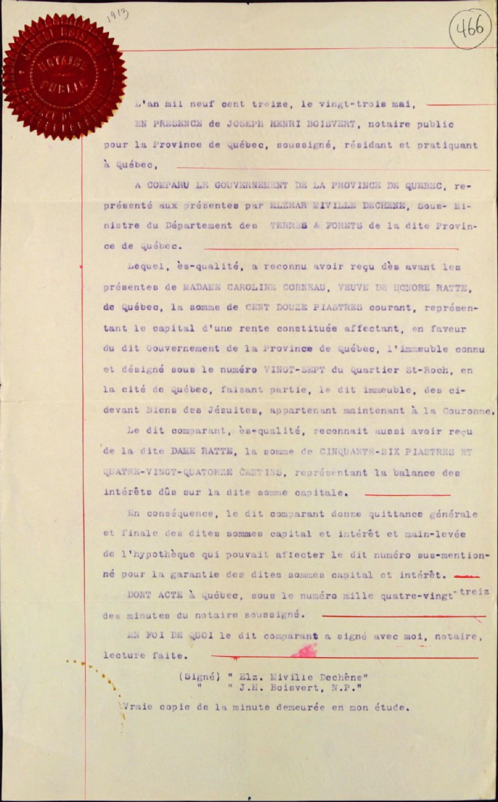 Rachat de rentes constituées par le Gouvernement de la province de Québec, représenté par Elzéar Miville dit Dechene, sous-ministre du Département des Terres & Forêts de ladite province