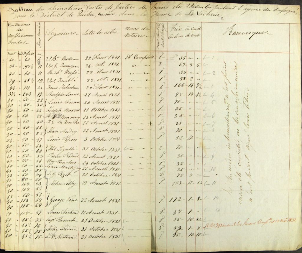 Tableau des aliénations faites de parties des biens des Jésuites pendant l'agence du soussigné, dans le district de Québec, savoir dans la Ferme de La Vacherie