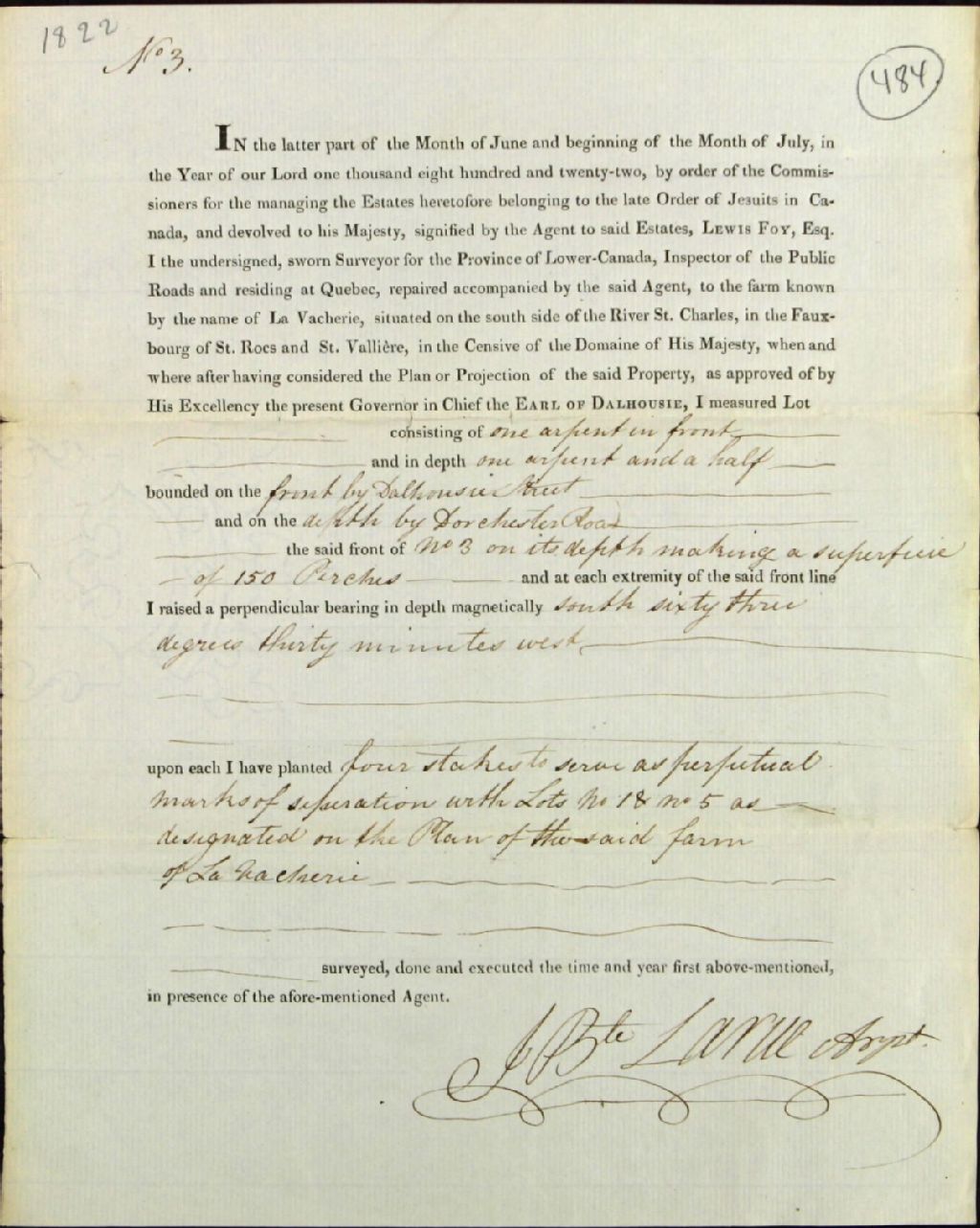 Certificat de bornage par ordre de la commission des Terres de la Couronne, à Lewis Foy, agent des biens des Jésuites, pour les lots appartenant à la terre de La Vacherie, paroisse Saint-Roch, 1822, Archives nationales à Québec, Fonds Ministère des Terres et Forêts, (03Q,E21,S64,SS5,SSS8,D484).