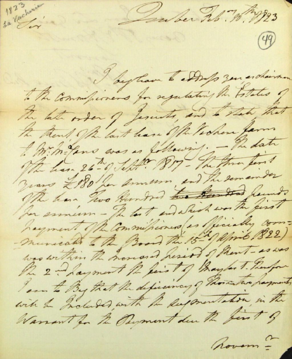 Lettre de William Holmes, médecin, à Sir Francis Nathaniel Burton, lieutenant-gouverneur, au sujet du bail de la ferme nommée la Vacherie accordé à monsieur McCans en date du 26 septembre 1817, 10 février 1823, Archives nationales à Québec, Fonds Ministère des Terres et Forêts, (03Q,E21,S64,SS5,SSS8,D49).