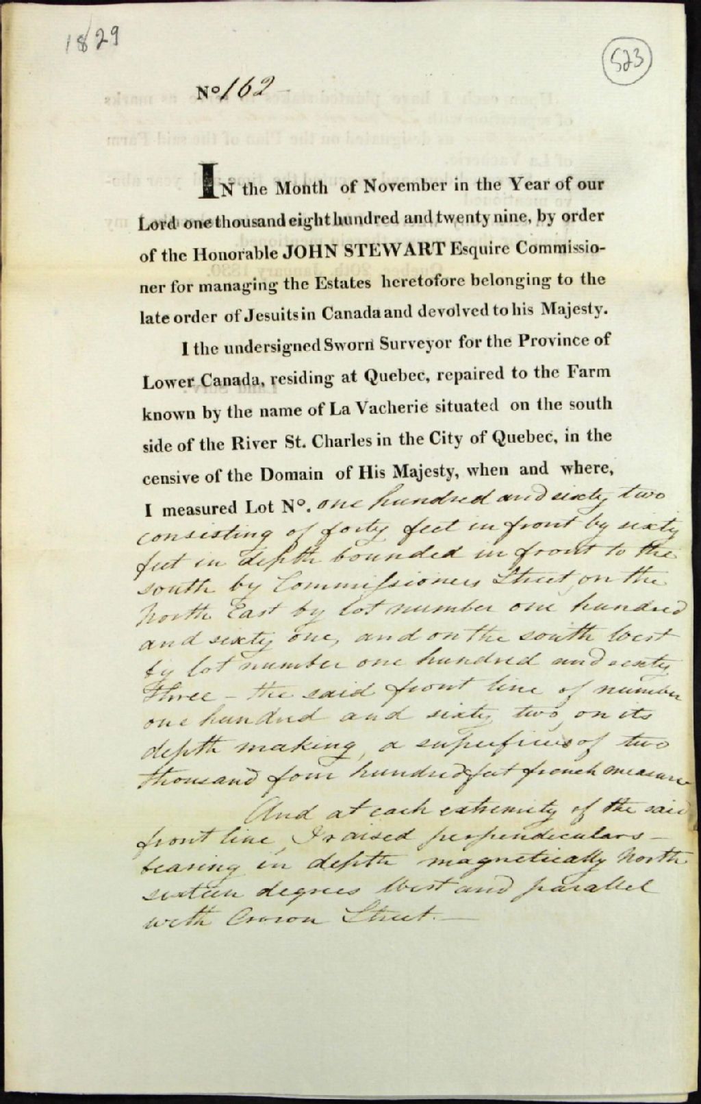Procès-verbaux de bornage par ordre de l'honorable John Stewart, agent des biens des Jésuites, concernant les terres de La Vacherie, paroisse Saint-Roch, situées du côté sud de la rivière Saint-Charles, dans la ville de Québec, du lot de Pierre Emond, charpentier, 20 janvier 1830, Archives nationales à Québec, Fonds Ministère des Terres et Forêts, (03Q,E21,S64,SS5,SSS8,D523).