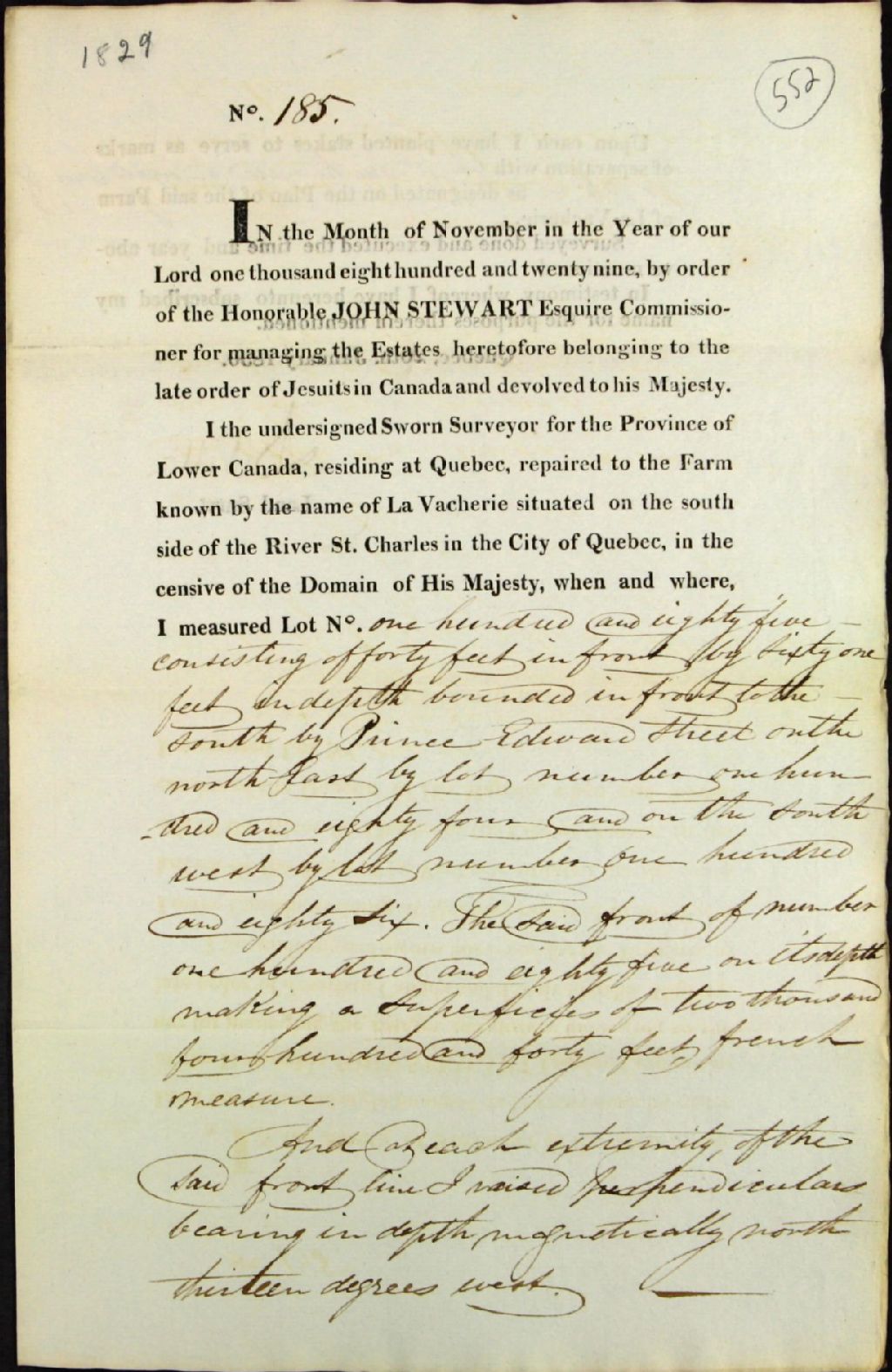 Procès-verbaux de bornage par ordre de l'honorable John Stewart, agent des biens des Jésuites, concernant les terres de La Vacherie, paroisse Saint-Roch, situées du côté sud de la rivière Saint-Charles, dans la ville de Québec, du lot de Jean Beaupré, 20 janvier 1830, Archives nationales à Québec, Fonds Ministère des Terres et Forêts, (03Q,E21,S64,SS5,SSS8,D552).
