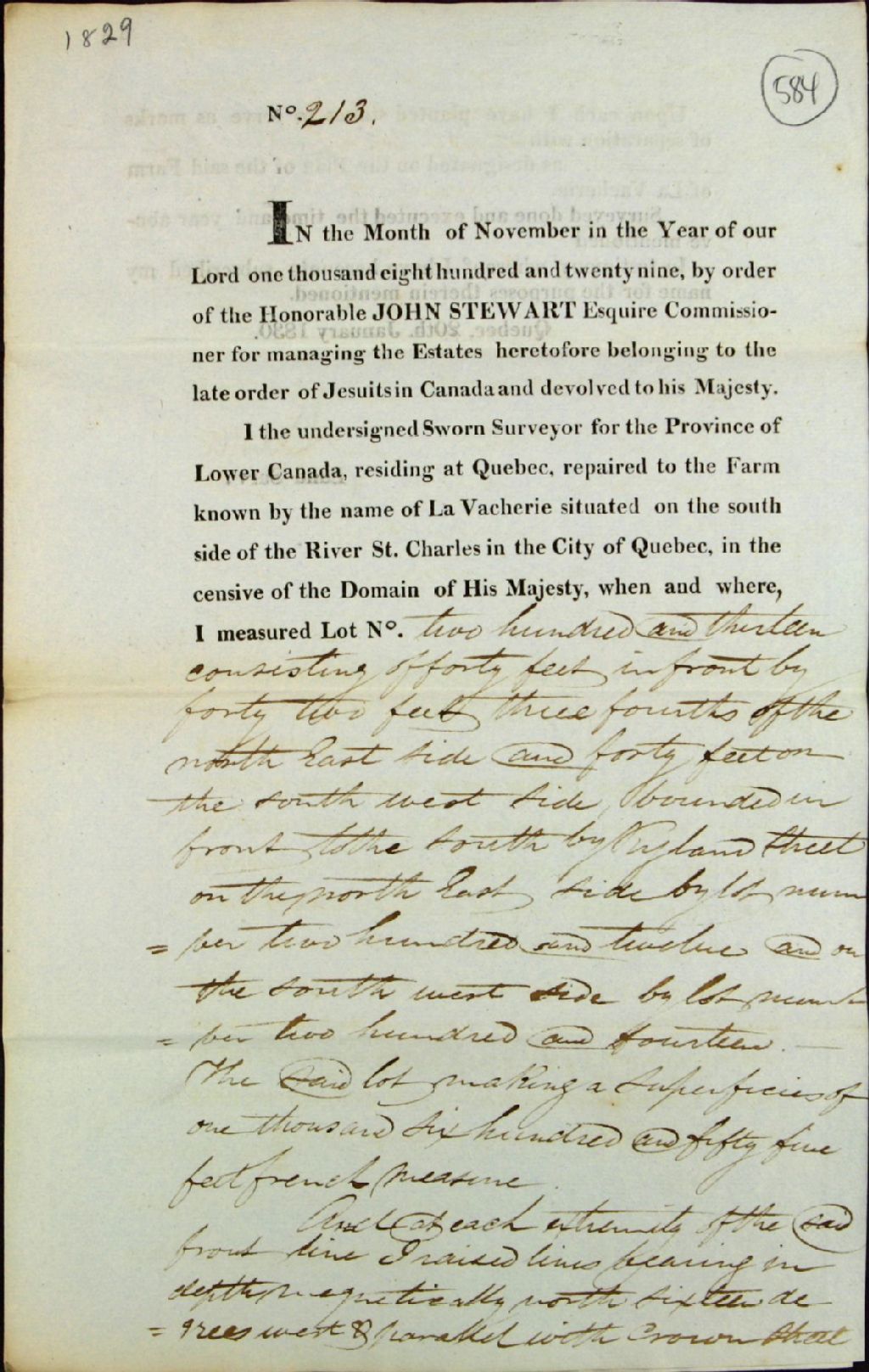 Procès-verbaux de bornage par ordre de l'honorable John Stewart, agent des biens des Jésuites, concernant les terres de La Vacherie, paroisse Saint-Roch, situées du côté sud de la rivière Saint-Charles, dans la ville de Québec, du lot de Pierre Rancourt, 20 janvier 1830, Archives nationales à Québec, Fonds Ministère des Terres et Forêts, (03Q,E21,S64,SS5,SSS8,D584).