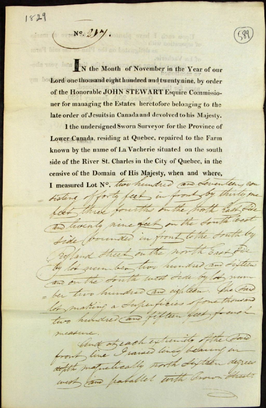 Procès-verbaux de bornage par ordre de l'honorable John Stewart, agent des biens des Jésuites, concernant les terres de La Vacherie, paroisse Saint-Roch, situées du côté sud de la rivière Saint-Charles, dans la ville de Québec, du lot de Jean-Baptiste Gagnon, 20 janvier 1830, Archives nationales à Québec, Fonds Ministère des Terres et Forêts, (03Q,E21,S64,SS5,SSS8,D589).