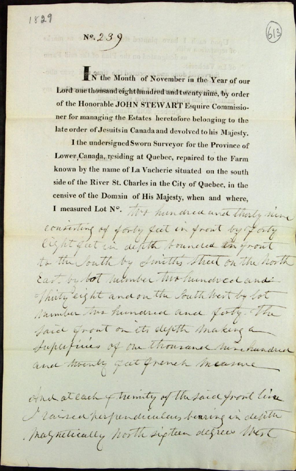 Procès-verbaux de bornage par ordre de l'honorable John Stewart, agent des biens des Jésuites, concernant les terres de La Vacherie, paroisse Saint-Roch, situées du côté sud de la rivière Saint-Charles, dans la ville de Québec, du lot de Bernard Emond (?), 20 janvier 1830, Archives nationales à Québec, Fonds Ministère des Terres et Forêts, (03Q,E21,S64,SS5,SSS8,D613).