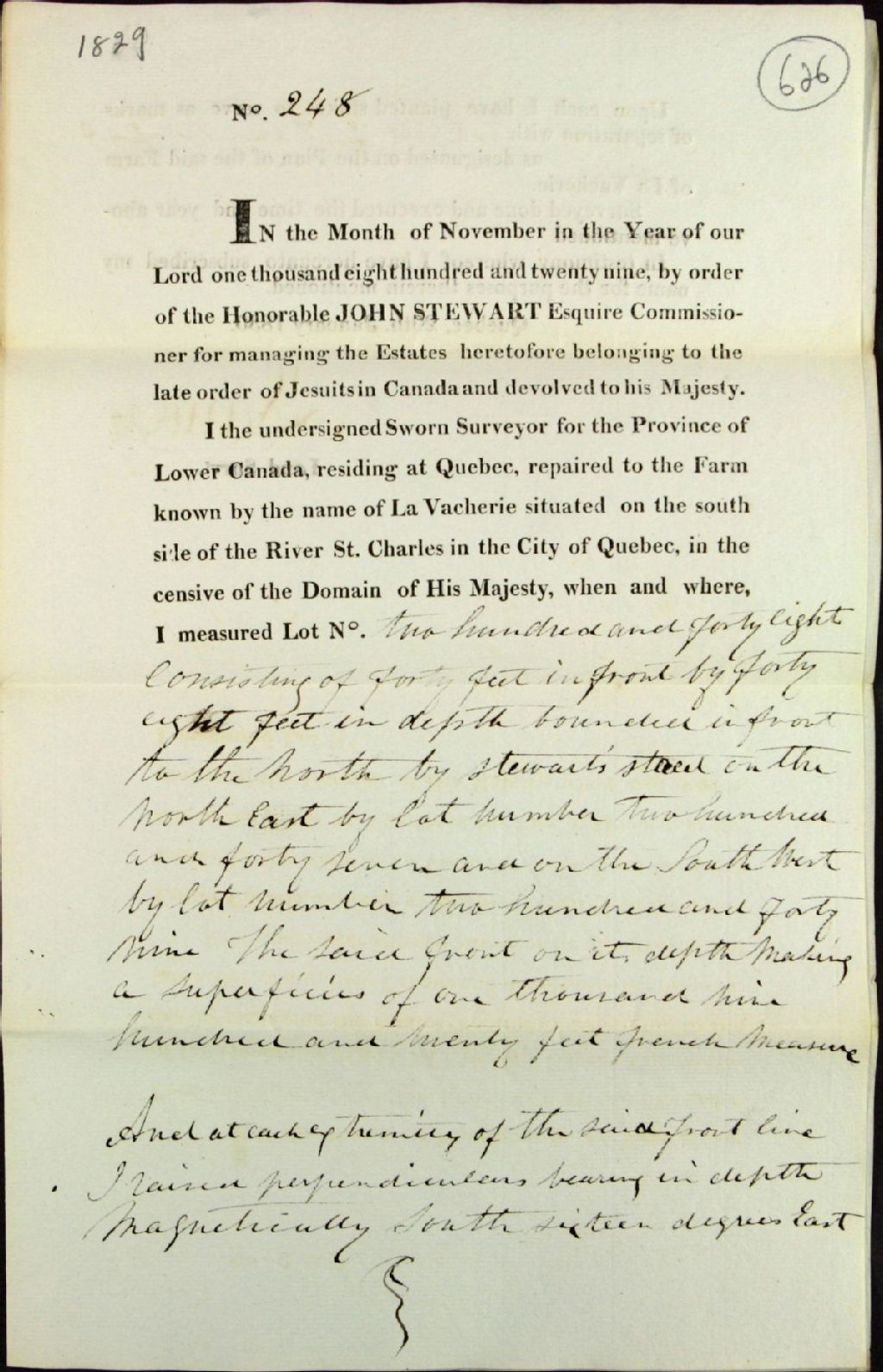 Procès-verbaux de bornage par ordre de l'honorable John Stewart, agent des biens des Jésuites, concernant les terres de La Vacherie, paroisse Saint-Roch, situées du côté sud de la rivière Saint-Charles, dans la ville de Québec, du lot de ? Emond