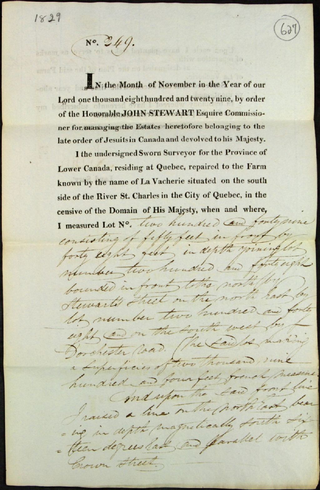 Procès-verbaux de bornage par ordre de l'honorable John Stewart, agent des biens des Jésuites, concernant les terres de La Vacherie, paroisse Saint-Roch, situées du côté sud de la rivière Saint-Charles, dans la ville de Québec, du lot de Burging (?) Emond, 20 janvier 1830, Archives nationales à Québec, Fonds Ministère des Terres et Forêts, (03Q,E21,S64,SS5,SSS8,D627).