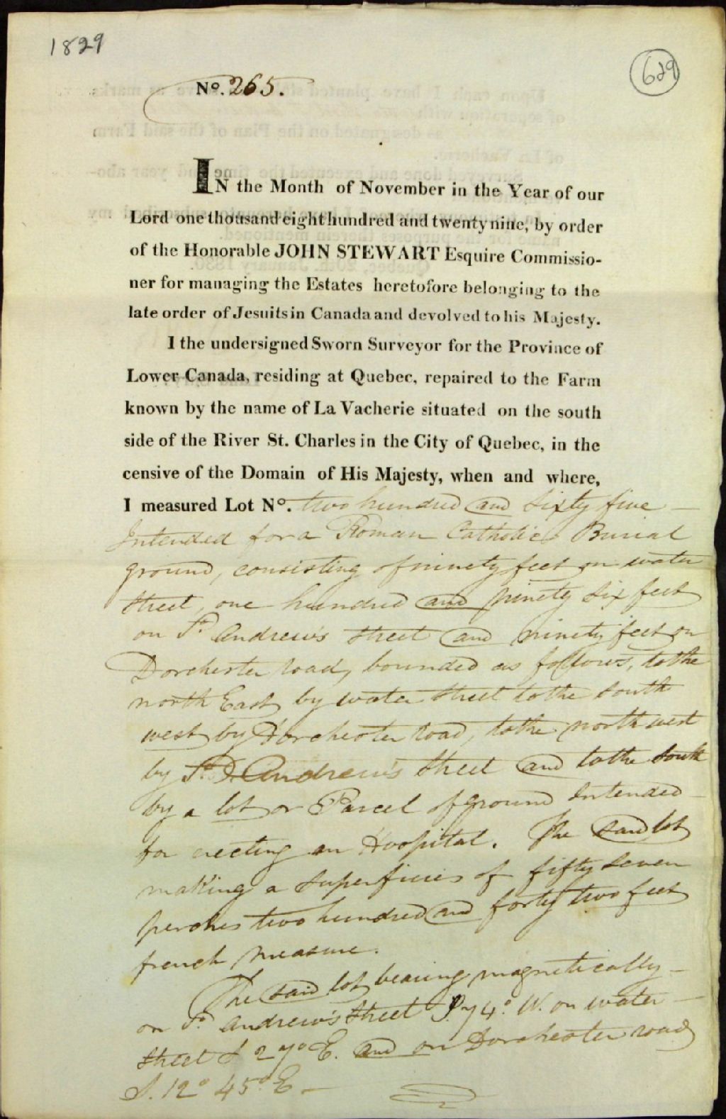 Procès-verbaux de bornage par ordre de l'honorable John Stewart, agent des biens des Jésuites, concernant les terres de La Vacherie, paroisse Saint-Roch, situées du côté sud de la rivière Saint-Charles, dans la ville de Québec, 20 janvier 1830, Archives nationales à Québec, Fonds Ministère des Terres et Forêts, (03Q,E21,S64,SS5,SSS8,D629).