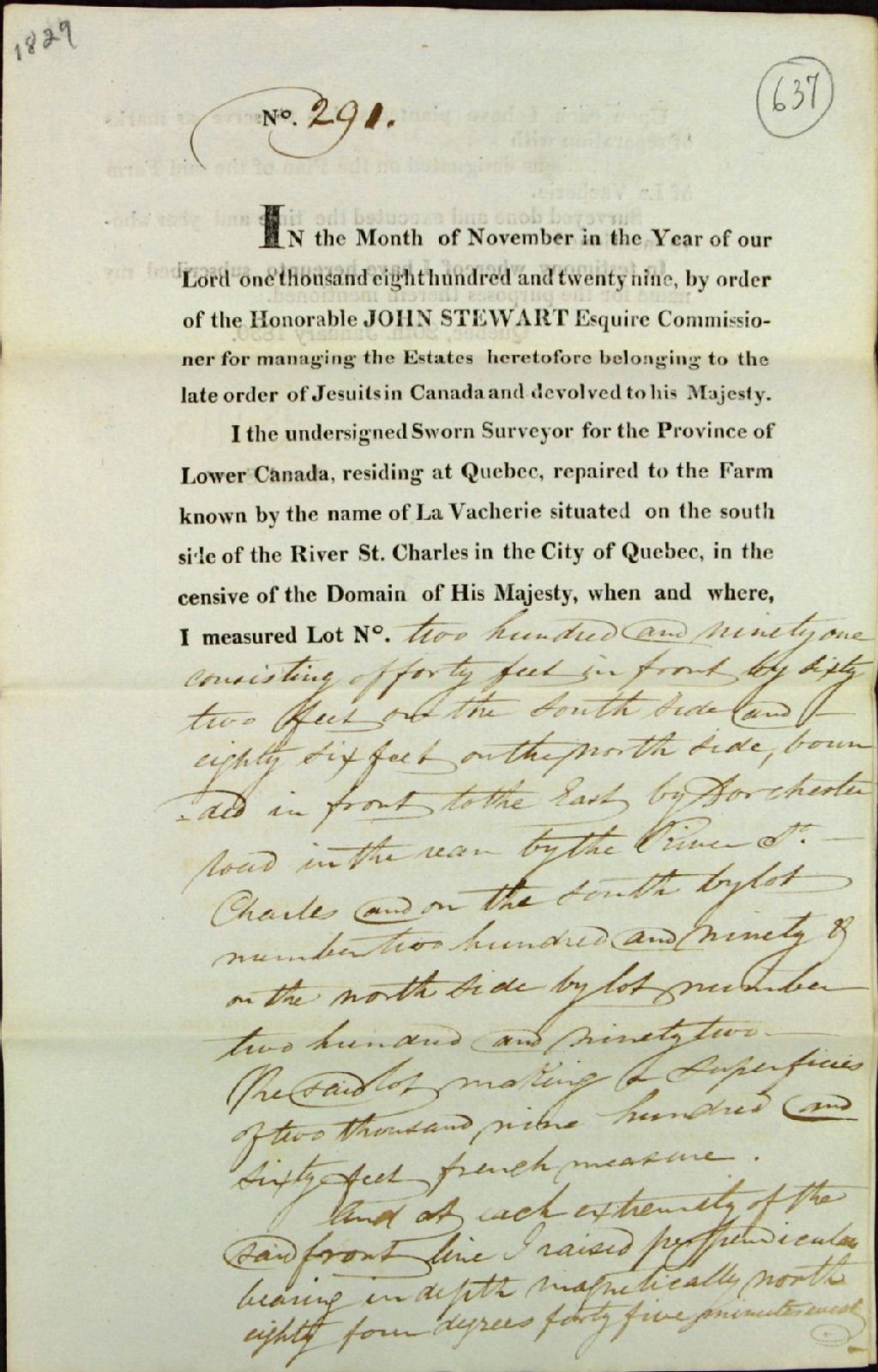 Procès-verbaux de bornage par ordre de l'honorable John Stewart, agent des biens des Jésuites, concernant les terres de La Vacherie, paroisse Saint-Roch, situées du côté sud de la rivière Saint-Charles, dans la ville de Québec, du lot de Donald Grant, 20 janvier 1830, Archives nationales à Québec, Fonds Ministère des Terres et Forêts, (03Q,E21,S64,SS5,SSS8,D637).