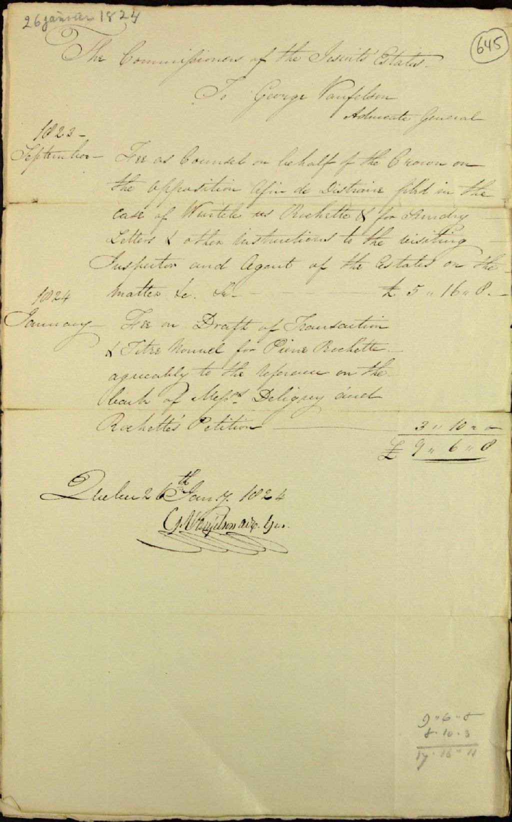 État de compte de George Vanfelson, avocat, au commissaire des biens des Jésuites, pour services professionnels, entre septembre 1823 et janvier 1824