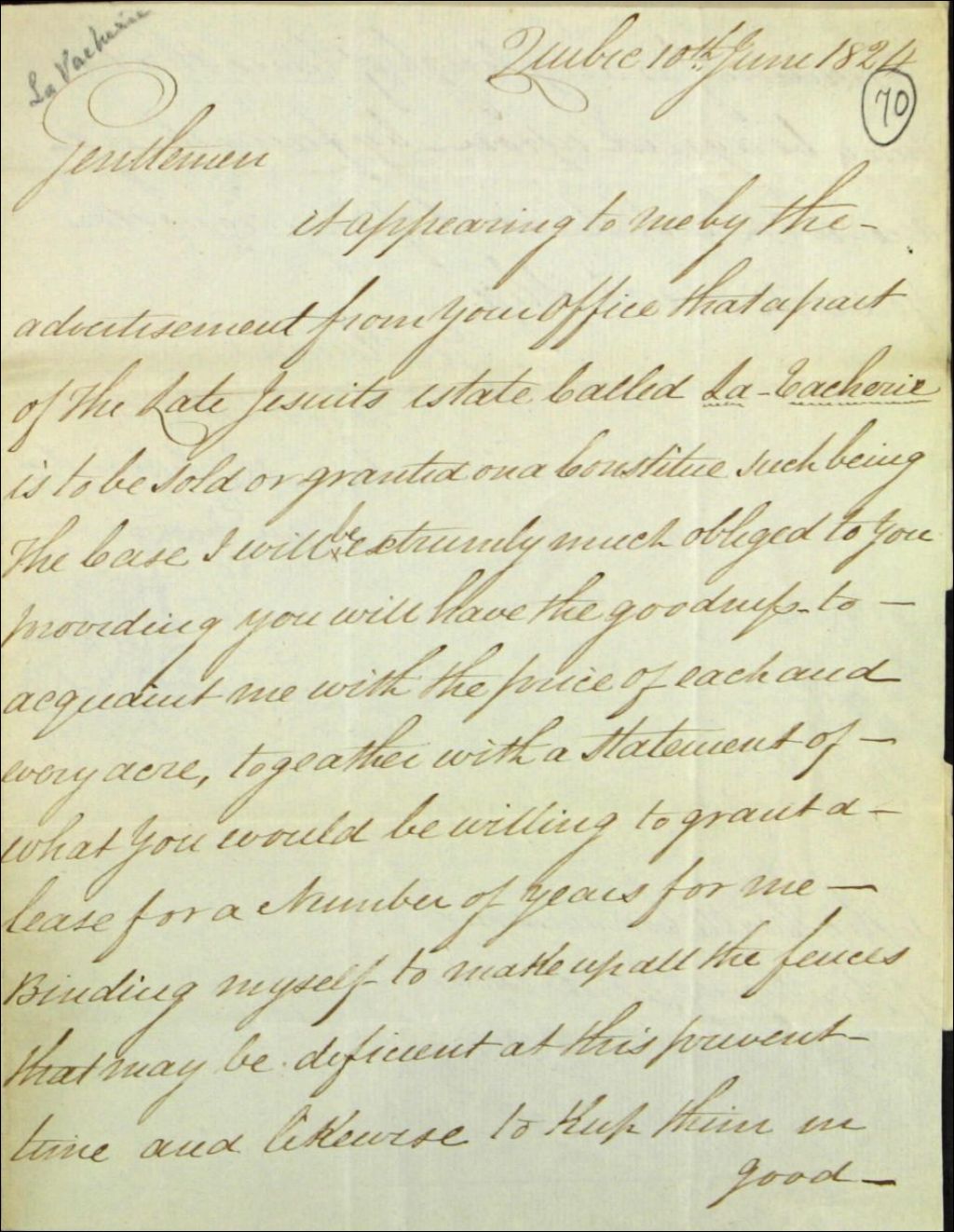 Lettre de David Sinclair, de la ville de Québec, aux commissaires des biens des Jésuites, de la ville de Québec, pour obtenir de l'information sur la vente ou la location de lots de la ferme nommée la Vacherie, 10 juin 1824, Archives nationales à Québec, Fonds Ministère des Terres et Forêts, (03Q,E21,S64,SS5,SSS8,D70).
