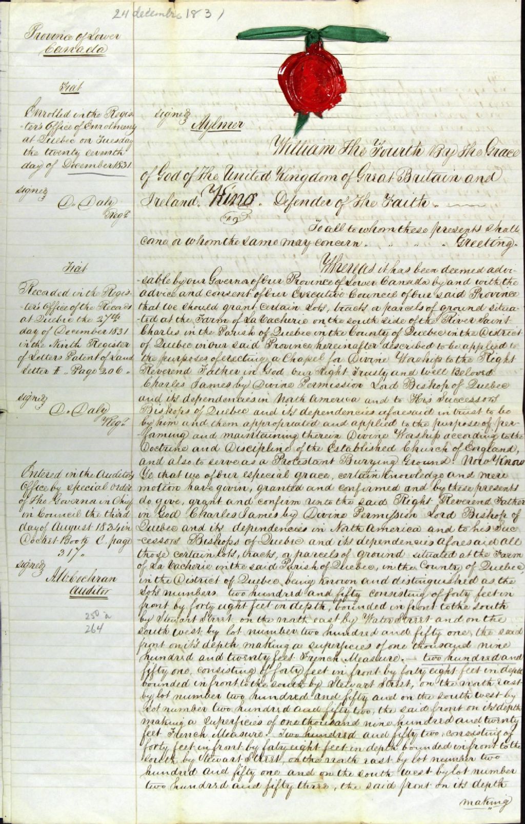 - Lettres patentes accordées par William IV, roi du Royaume Uni de Grande-Bretagne et d'Irlande, à l'Église Épiscopale, d'une parcelle de terre située dans la ferme nommée la Vacherie aux fins d'y établir une église et cimetière