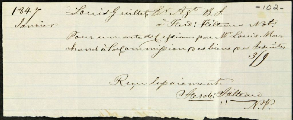 Reçu de Ferdinand Filteau, notaire, à Louis Guillet, agent des biens des Jésuites, pour un acte de cession par Louis Marchand, janvier 1847, Archives nationales à Québec, Fonds Ministère des Terres et Forêts, (03Q,E21,S64,SS5,SSS9,D102).