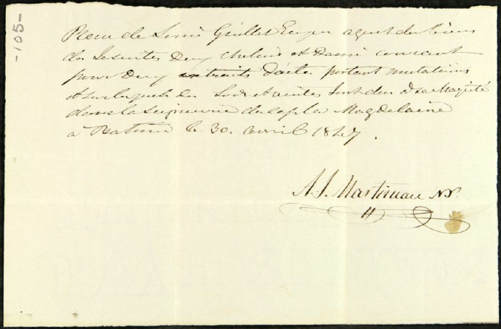 Reçu de André-Joseph Martineau, notaire public, à Louis Guillet, agent des biens des Jésuites, pour l'obtention d'extraits d'actes notariés, 30 avril 1847, Archives nationales à Québec, Fonds Ministère des Terres et Forêts, (03Q,E21,S64,SS5,SSS9,D105).