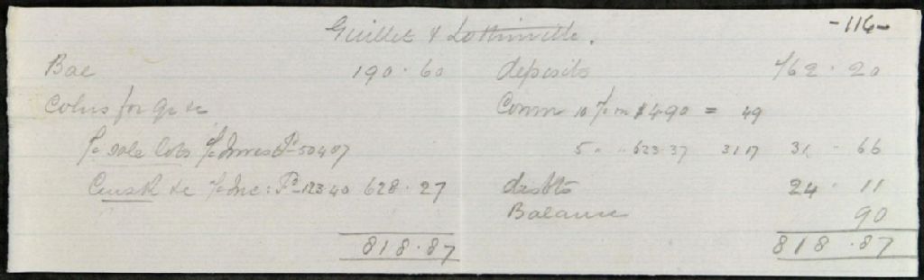 État de compte de Valère Guillet et Flavien Lottinville, 1860 - 1870, Archives nationales à Québec, Fonds Ministère des Terres et Forêts, (03Q,E21,S64,SS5,SSS9,D116).
