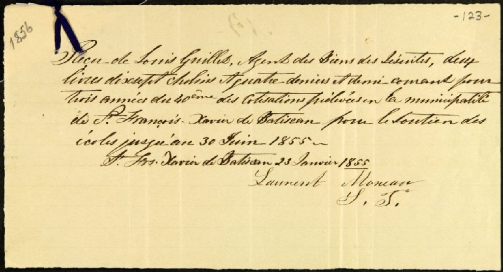 Reçus de Laurent Moreau, Valère Guillet, Joseph Grenier, Robert Trudel et Louis Guillet, à Louis Guillet, junior, agent des biens des Jésuites pour le district des Trois-Rivières, 23 janvier 1855 - 29 mars 1855, Archives nationales à Québec, Fonds Ministère des Terres et Forêts, (03Q,E21,S64,SS5,SSS9,D123).