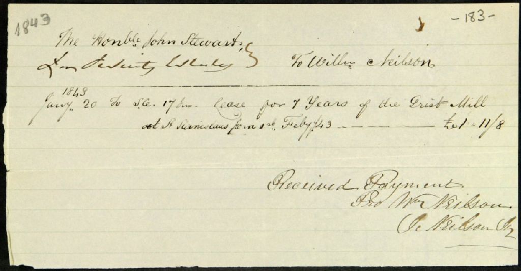 Reçu de William Neilson, à John Stewart, pour les Biens des Jésuites, pour le bail du moulin de Saint-Stanislas, vers 1843, Archives nationales à Québec, Fonds Ministère des Terres et Forêts, (03Q,E21,S64,SS5,SSS9,D183).
