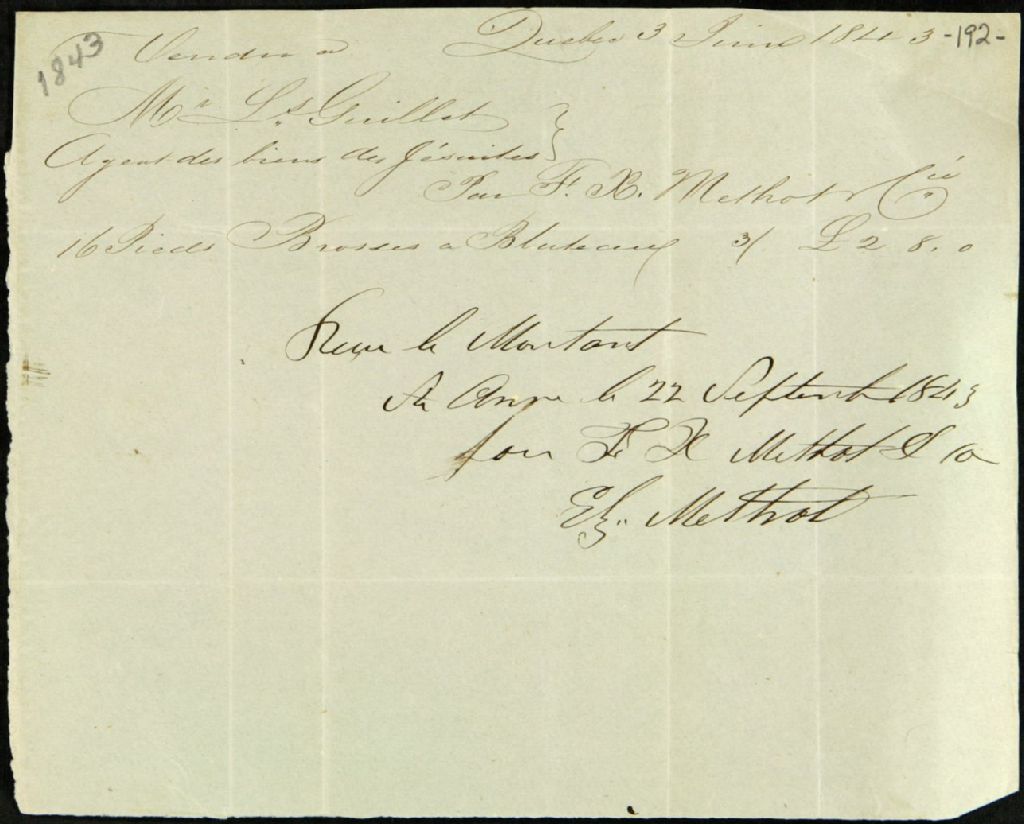 Reçu de François-Xavier Méthot et Compagnie, à Louis Guillet, agent des biens des Jésuites pour le district des Trois-Rivières, pour achat de brosses à bluteau, 22 septembre 1843, Archives nationales à Québec, Fonds Ministère des Terres et Forêts, (03Q,E21,S64,SS5,SSS9,D192).