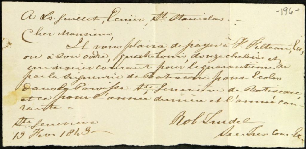 Reçu de payment par Robert Trudel, secrétaire-trésorier, à Louis Guillet, de Saint-Stanislas, pour Ferdinand Filteau, pour les écoles de la paroisse de Sainte-Geneviève de Batiscan, 13 février 1843, Archives nationales à Québec, Fonds Ministère des Terres et Forêts, (03Q,E21,S64,SS5,SSS9,D196).