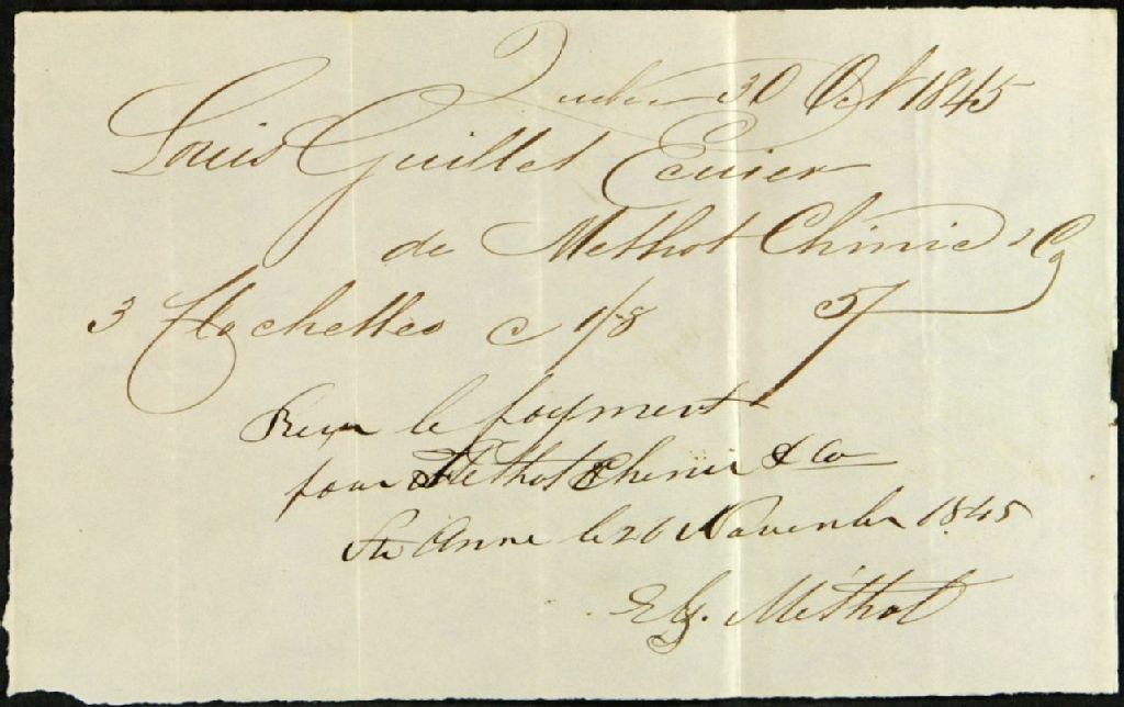 Reçus de Méthot, Chinic et Compagnie, Gilbert Désaunier, meunier, Marcel Lymburner, Robert Trudel, notaire public, J.F. Bélanger, agent de la Quebec Gazette, Amable Bochet, arpenteur, William Phillips, Ferdinand Filteau, Jean Marchand, meunier, J.E. Dumoulin, notaire public, William Burn, Jean-Baptiste Prévost, registrateur, Jean-Baptiste Fréchette, William Price & Co., Guenet(?) et Royer et Louis Dupuis, à Louis Guillet, agent des biens des Jésuites pour le district des Trois-Rivières, 8 août 1845 - 22 décembre 1845, Archives nationales à Québec, Fonds Ministère des Terres et Forêts, (03Q,E21,S64,SS5,SSS9,D201).