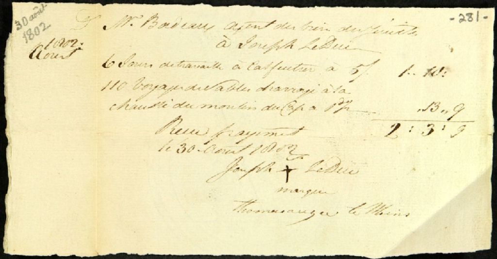 Reçu de Joseph Leduc, à Joseph Badeaux, agent des biens des Jésuites pour le district des Trois-Rivières, pour travail au moulin du Cap-de-la-Madeleine, 30 août 1802, Archives nationales à Québec, Fonds Ministère des Terres et Forêts, (03Q,E21,S64,SS5,SSS9,D281).