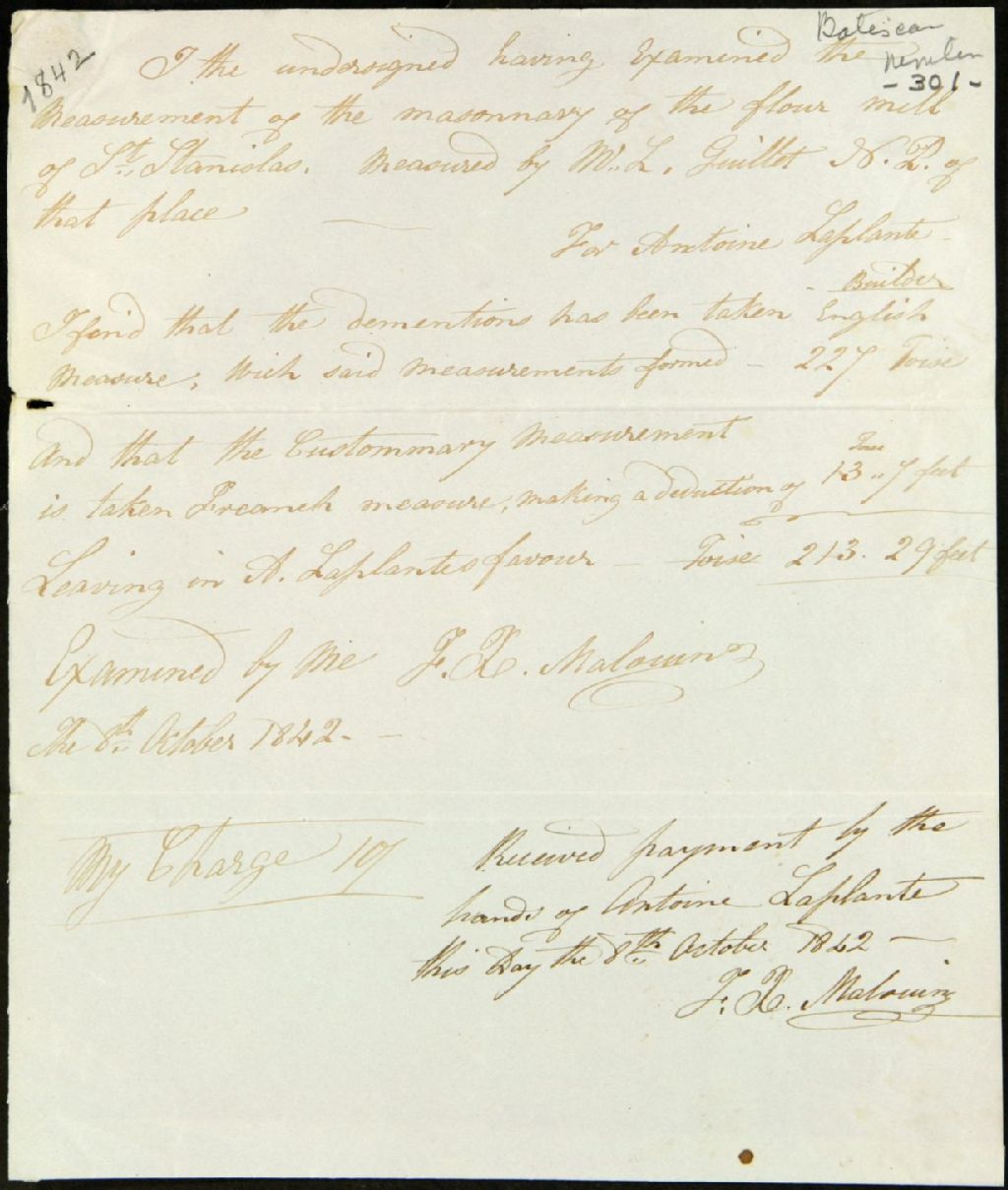 - Examen de la maçonnerie du moulin à farine de Saint-Stanislas par François-Xavier Malouin ; Devis de maçonnerie du moulin seigneurial de la paroisse de Saint-Stanislas effectué par Antoine Tessier dit Laplante ; et reçu dudit Tessier
