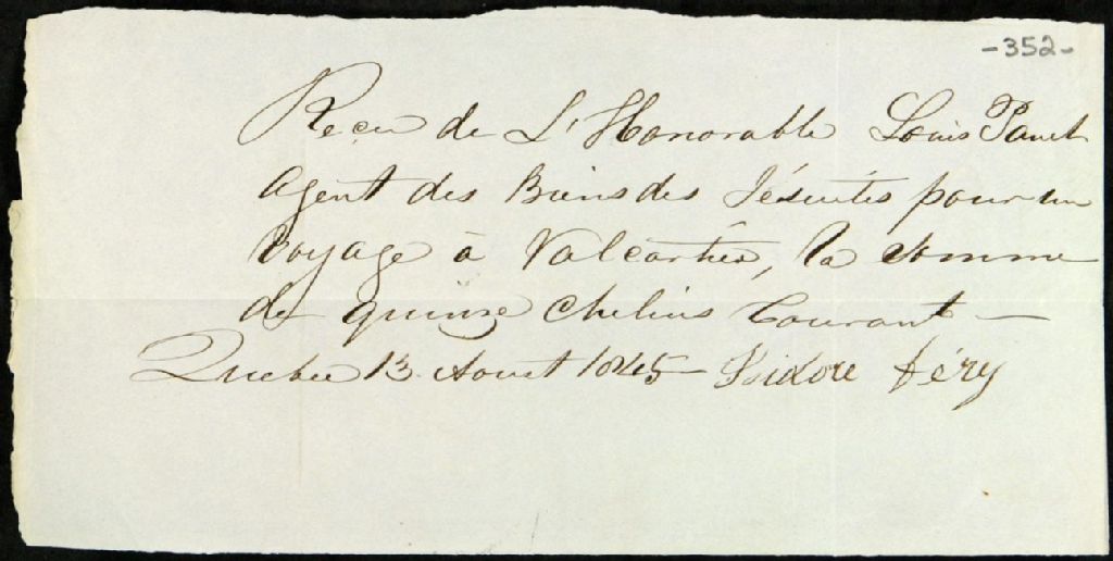 Reçu de Isidore Déry, à Louis Panet, agent des biens des Jésuites, pour un voyage à Valcartier, 13 août 1845, Archives nationales à Québec, Fonds Ministère des Terres et Forêts, (03Q,E21,S64,SS5,SSS9,D352).