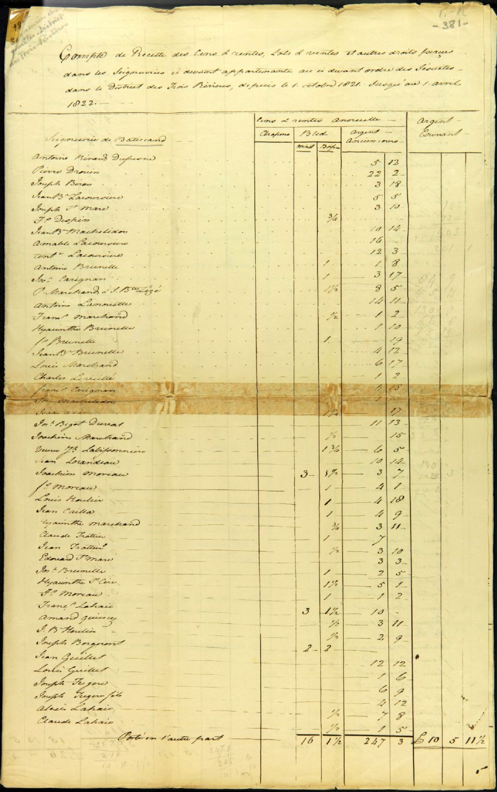 Compte de recette des droits perçus dans les seigneuries appartenant aux Jésuites dans le district des Trois-Rivières, pour la période du 1er octobre 1821 au 1er avril 1822, rédigé par Joseph Badeaux, agent des biens des Jésuites pour le district des Trois-Rivières