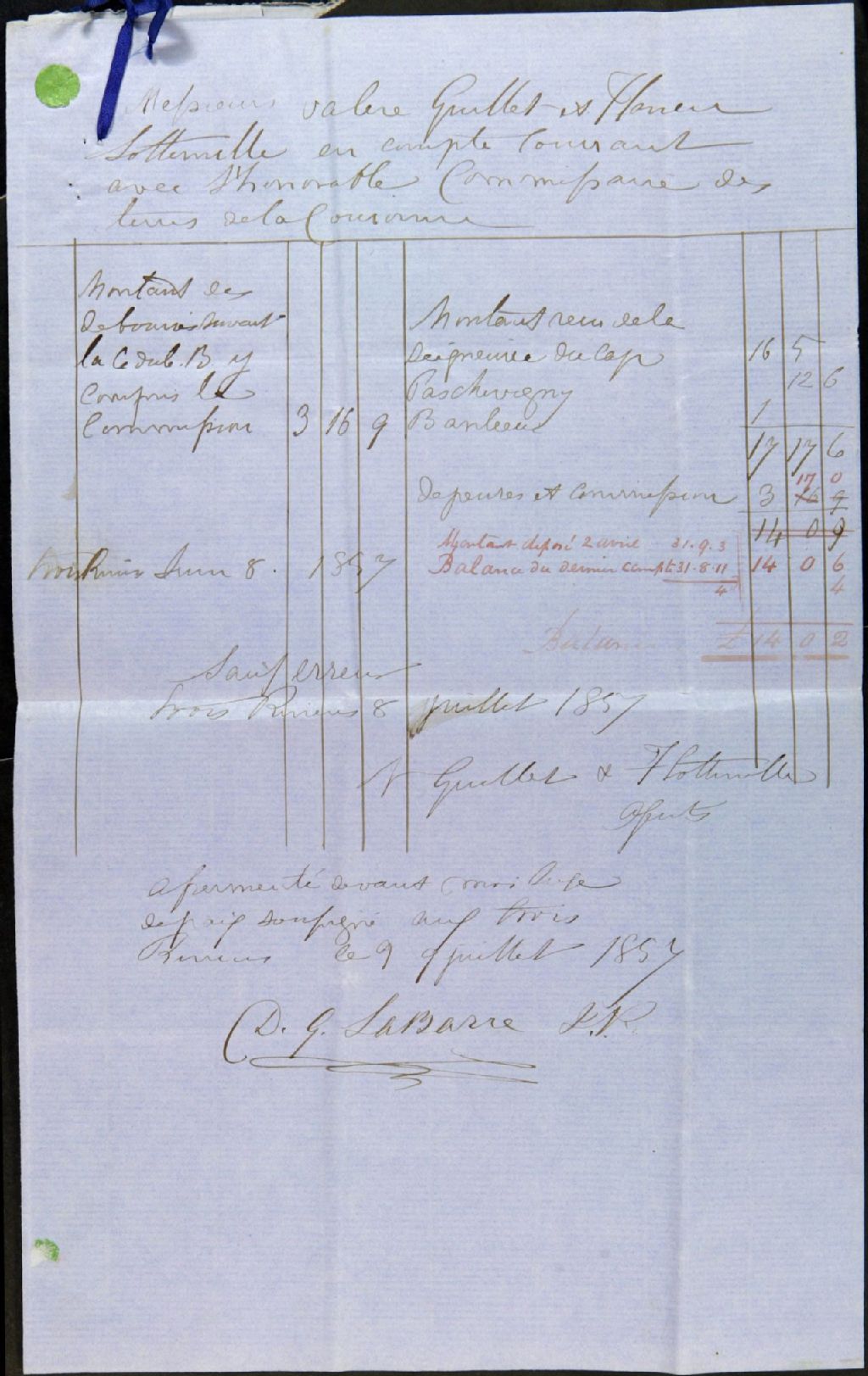 - Compte général des argents reçus et déboursés par Valère Guillet et Flavien Lottinville, agents des biens des Jésuites pour la seigneurie du Cap-de-la-Madeleine et des fiefs situés en la ville et banlieue des Trois-Rivières, depuis le 1er avril jusqu'au 30 juin 1857