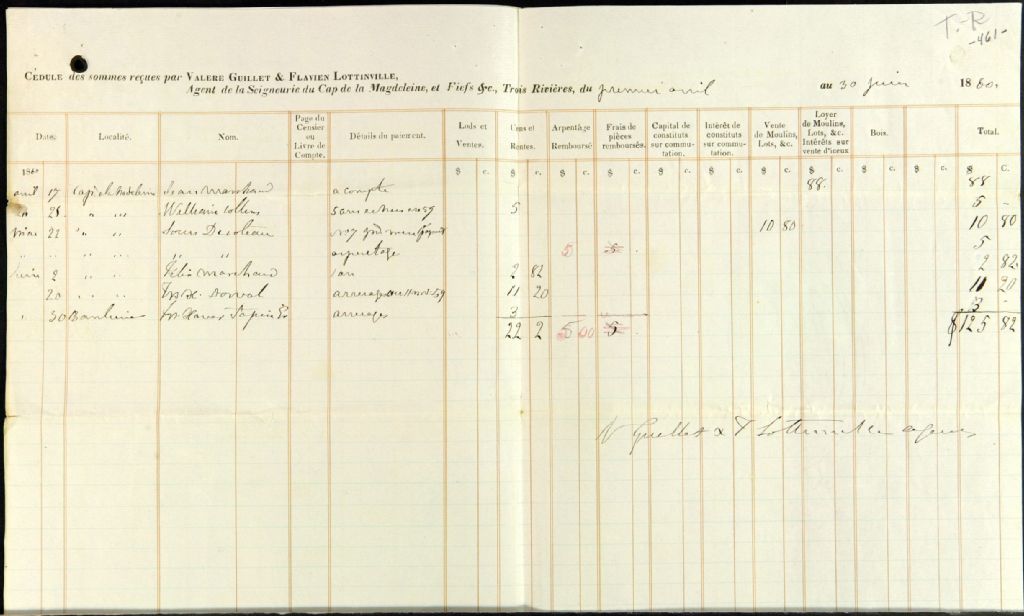 - Compte général des argents reçus et déboursés par Valère Guillet et Flavien Lottinville, agents des biens des Jésuites pour la seigneurie du Cap-de-la-Madeleine et des fiefs situés en la ville et banlieue des Trois-Rivières, depuis le 1er avril jusqu'au 30 juin 1860
