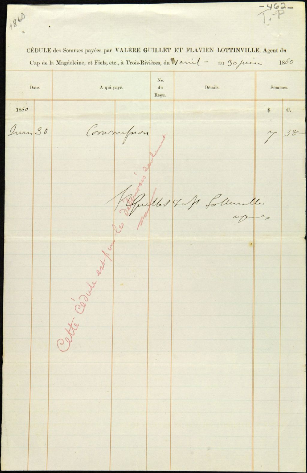 Cédule des sommes payées par Valère Guillet et Flavien Lottinville, agents des biens des Jésuites pour la seigneurie du Cap-de-la-Madeleine et des fiefs situés en la ville et banlieue des Trois-Rivières, depuis le 1er avril jusqu'au 30 juin 1860