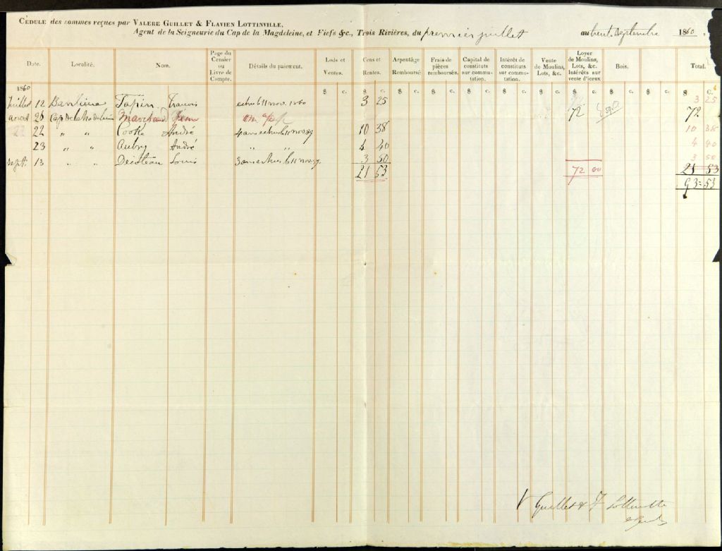 Compte général des argents reçus et déboursés par Valère Guillet et Flavien Lottinville, agents des biens des Jésuites pour la seigneurie du Cap-de-la-Madeleine et des fiefs situés en la ville et banlieue des Trois-Rivières, depuis le 1er juillet jusqu'au 30 septembre 1860, 1er octobre 1860, Archives nationales à Québec, Fonds Ministère des Terres et Forêts, (03Q,E21,S64,SS5,SSS9,D467).