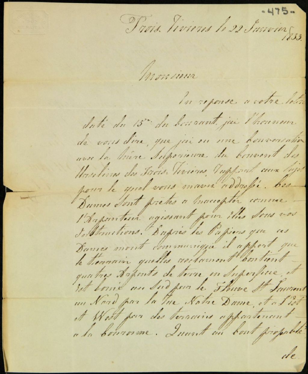 Lettre de Joseph P. Bureau, arpenteur, à Joseph Bouchette, arpenteur général de Québec, relatif à un terrain des Ursulines des Trois-Rivières, 22 janvier 1833, Archives nationales à Québec, Fonds Ministère des Terres et Forêts, (03Q,E21,S64,SS5,SSS9,D475).