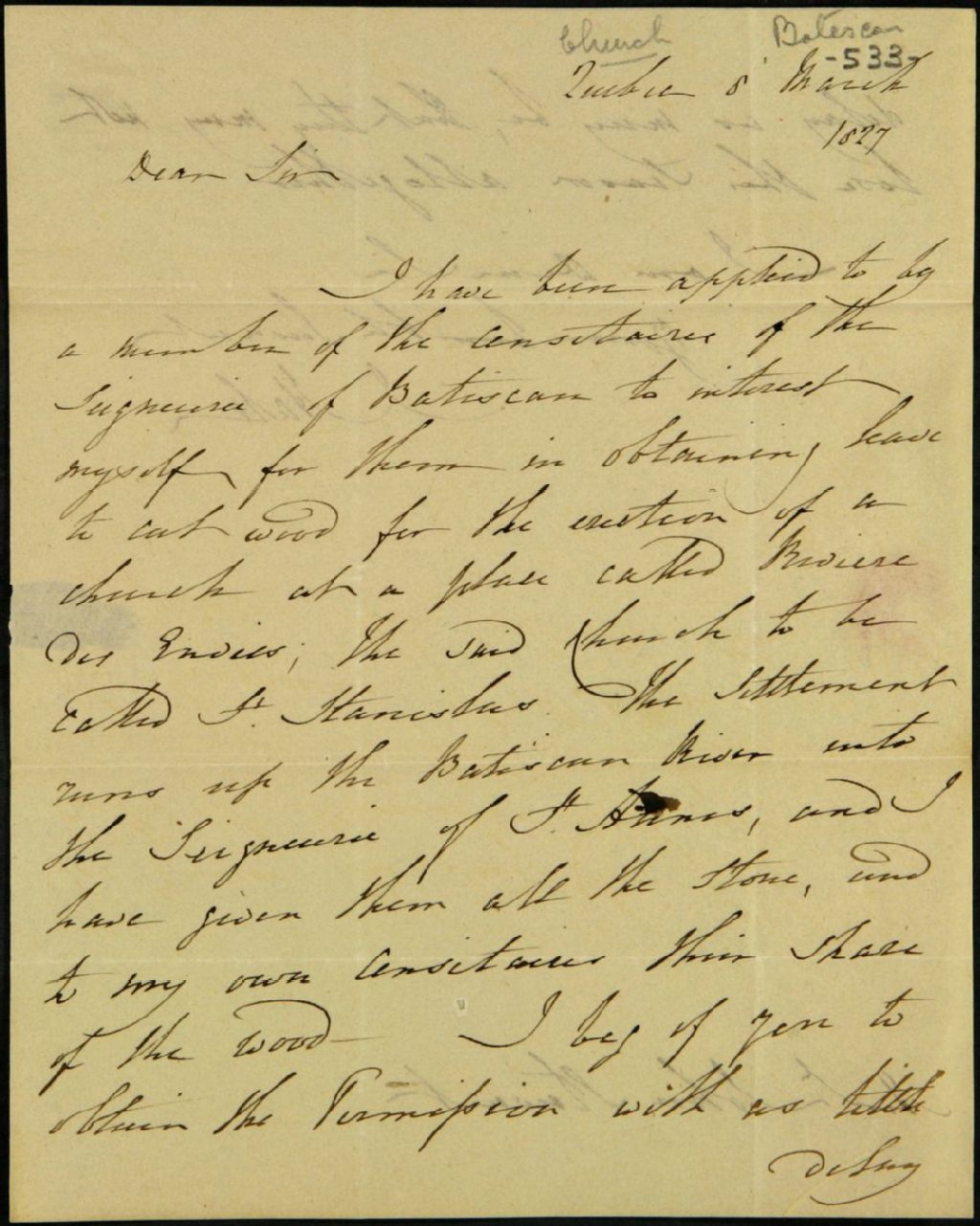 Lettre de J. Hale, de Québec, à John Stewart, pour obtenir le droit de couper du bois à l'érection d'une église à la rivière des Envies (Saint-Stanislas), seigneurie de Batiscan, 8 mars 1827, Archives nationales à Québec, Fonds Ministère des Terres et Forêts, (03Q,E21,S64,SS5,SSS9,D533).