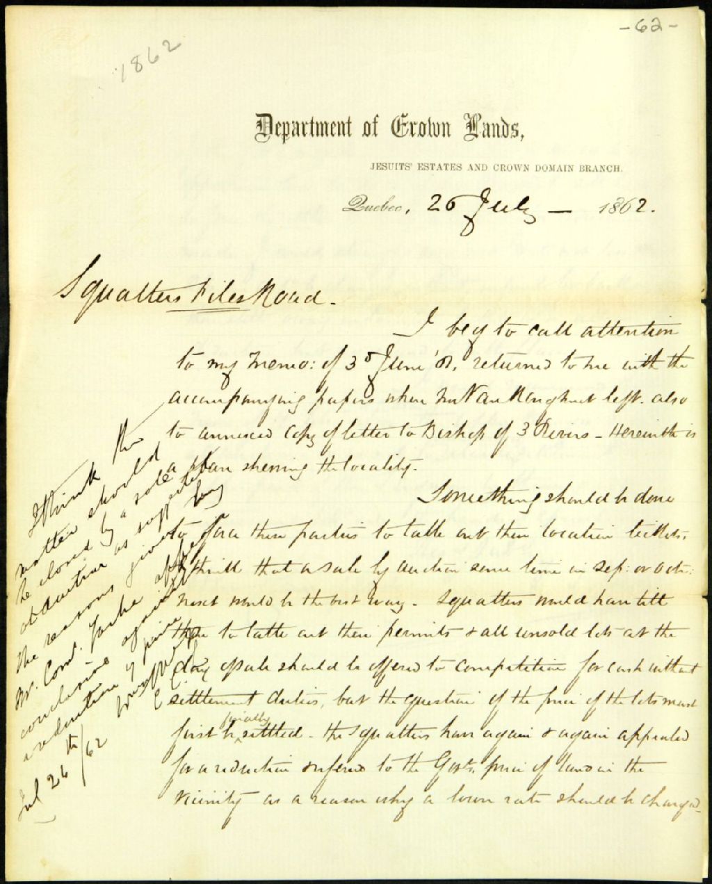 Mémoire de F. J. Judah, du département des Terres de la Couronne, concernant les squatters des [Piles Road], 26 juillet 1862, Archives nationales à Québec, Fonds Ministère des Terres et Forêts, (03Q,E21,S64,SS5,SSS9,D62).