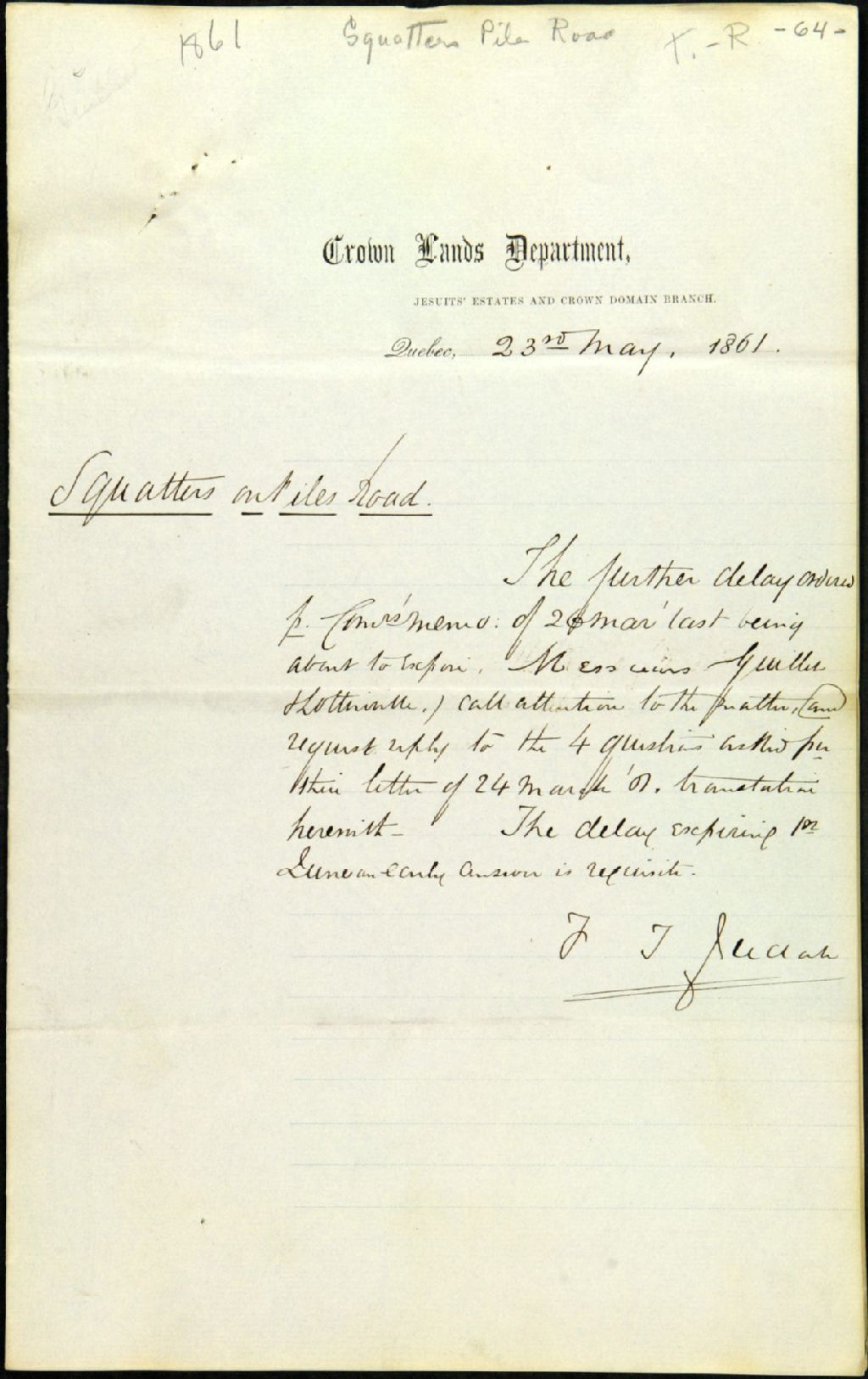 Lettre de Valère Guillet et Flavien Lottinville pour obtenir des instructions à l'attribution de lots aux squatters des [ Piles Road], rédigé à Trois-Rivières le 24 mars 1861, 24 mars 1861 -23 mai 1861, Archives nationales à Québec, Fonds Ministère des Terres et Forêts, (03Q,E21,S64,SS5,SSS9,D64).