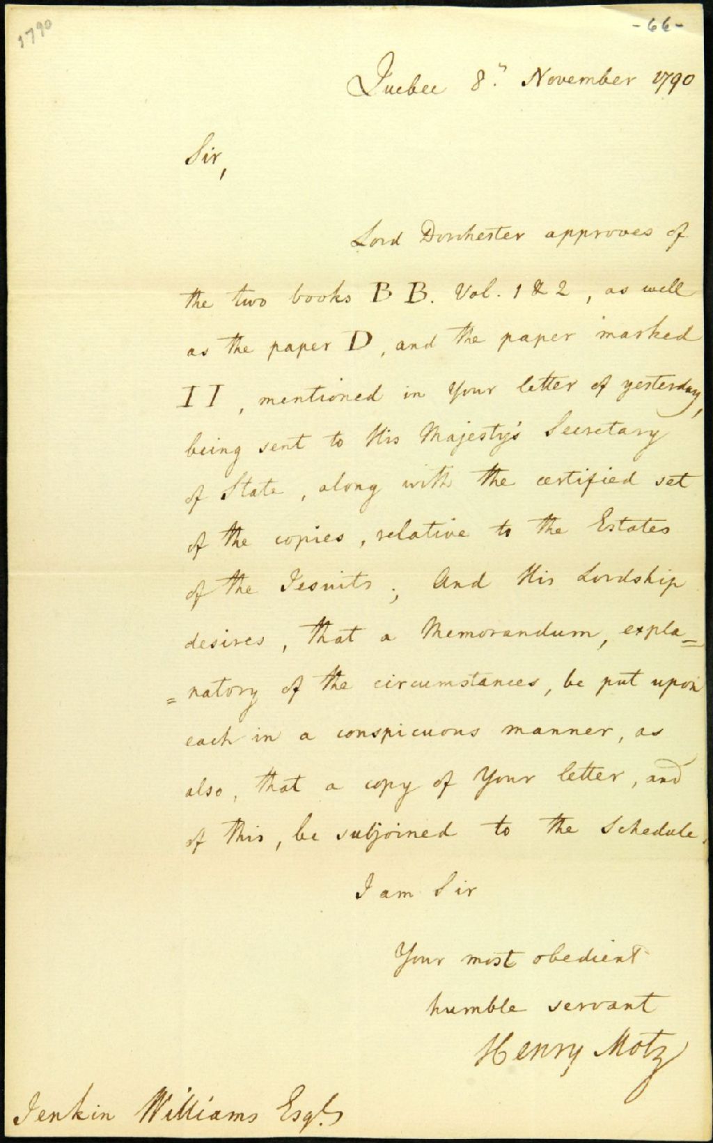 Lettre de Henry Motz, à Jenkin Williams, relative aux archives des biens des Jésuites, 8 novembre 1790, Archives nationales à Québec, Fonds Ministère des Terres et Forêts, (03Q,E21,S64,SS5,SSS9,D66).