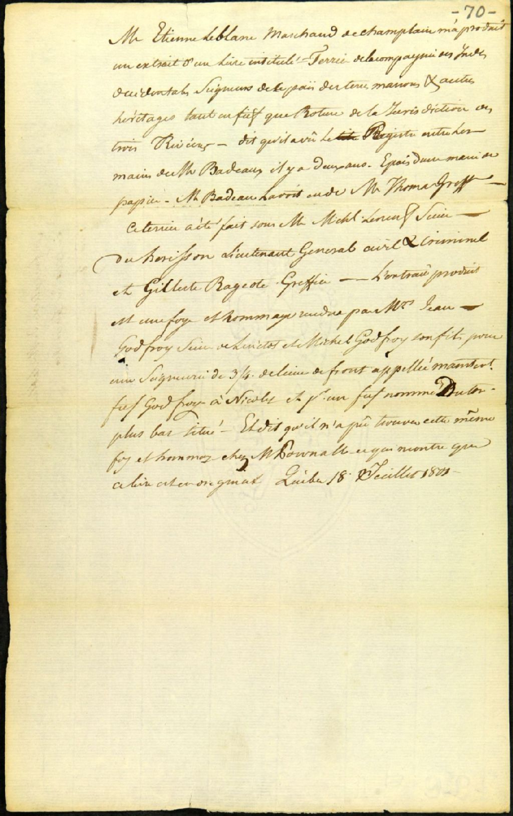 Informations fournies par Etienne Leblanc, marchand de Champlain, au sujet de la seigneurie de Mantet, fief Godefroy et Dutor